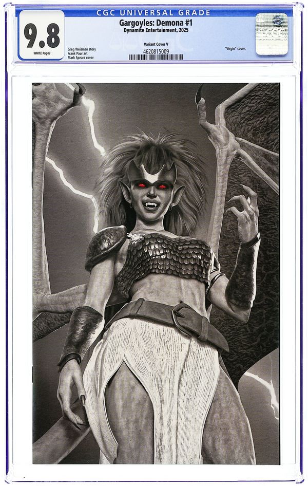 Published 2025 (est.) by Dynamite Entertainment.Gargoyles Demona (2025 Dynamite) 1V CGC 9.8 Spears B&W Virgin 1:10 Variant
