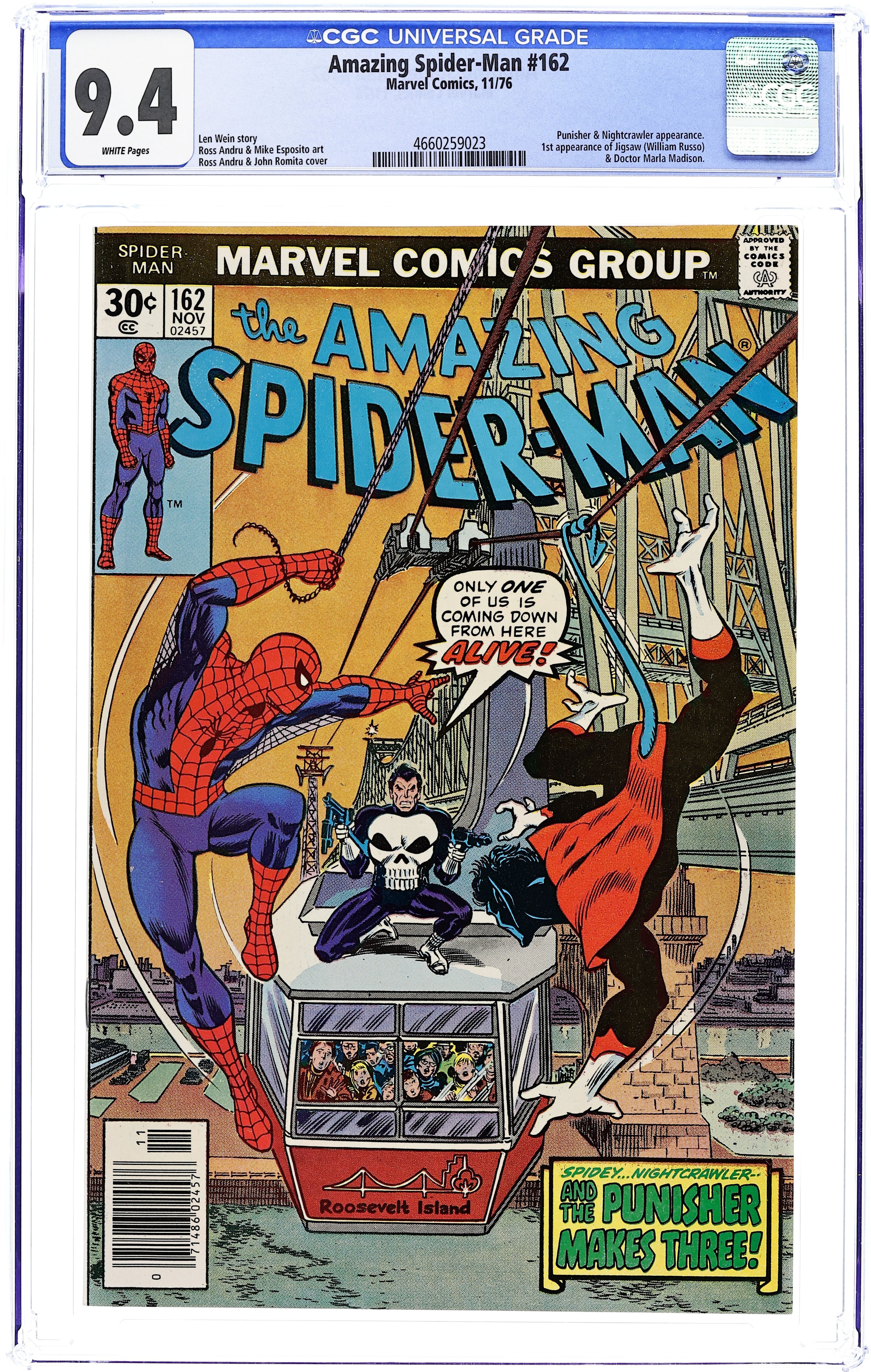 Direct Edition. To Fight the Unbeatable Foe!" Part 2 of 2. Script by Roger Stern. Art by John Romita Jr. (breakdowns) and Jim Mooney (finishes). Cover by John Romita Jr. and Al Milgrom. The Spectacular Spider-Man and the Juggernaut battle from cover to cover across New York City! The web-slinger is furious after the Juggernaut ripped Madame Web out of her life support chair last issue! And with his clairvoyant friend now lying in a coma, the fighting mad wall-crawler vows to do whatever it takes to defeat his invincible foe! Spider-Man throws steel girders, wrecking balls, gasoline trucks, and the proverbial kitchen sink at the Juggernaut! But nothing works! Is there any way to stop the indestructible brute? Your friendly neighborhood Spider-Man will find it or die trying! (Notes: The Juggernaut returns in Uncanny X-Men 183. He clashes with the wall-crawler again in Marvel Team-Up 150. Madame Web appears next in Amazing Spider-Man 239.) 36 pgs. Cover price $0.60.