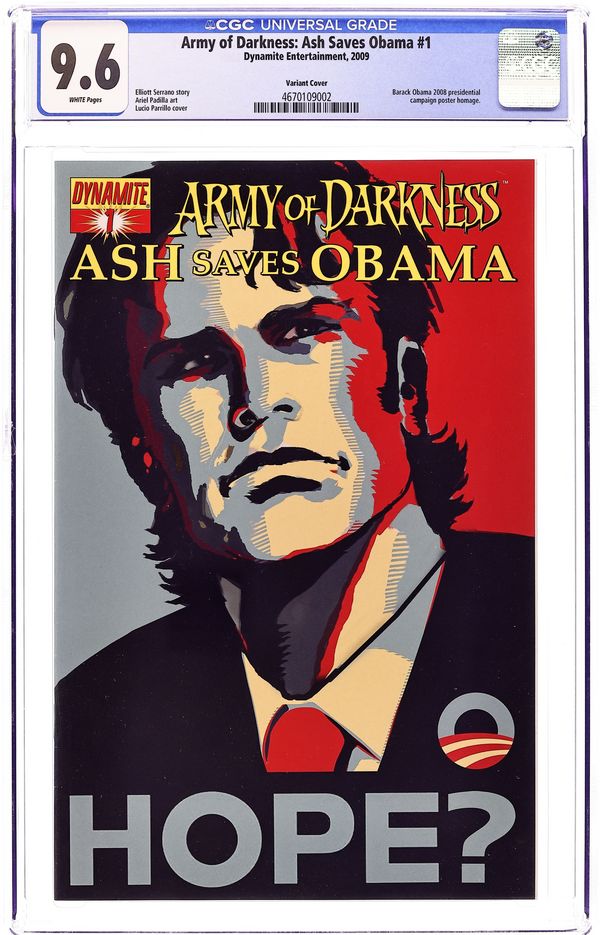 Cover by Lucio Parillo. Written by Elliott Serrano. Art by Ariel Padilla. He's faced them all, but Ashley J. Williams is about to face the greatest horror of his entire deadite-kickin' career - a comic book convention! But this ain't any ol' comic book convention, this one features a special appearance from the president of the United States of America - Barack Obama! How do things go from there when Ash and Obama are in the same place at the same time? And did we happen to mention that the Necronomicon is there doing the thing it does best - turned ordinary humans into the demon possessed undead! Cover price $3.50.