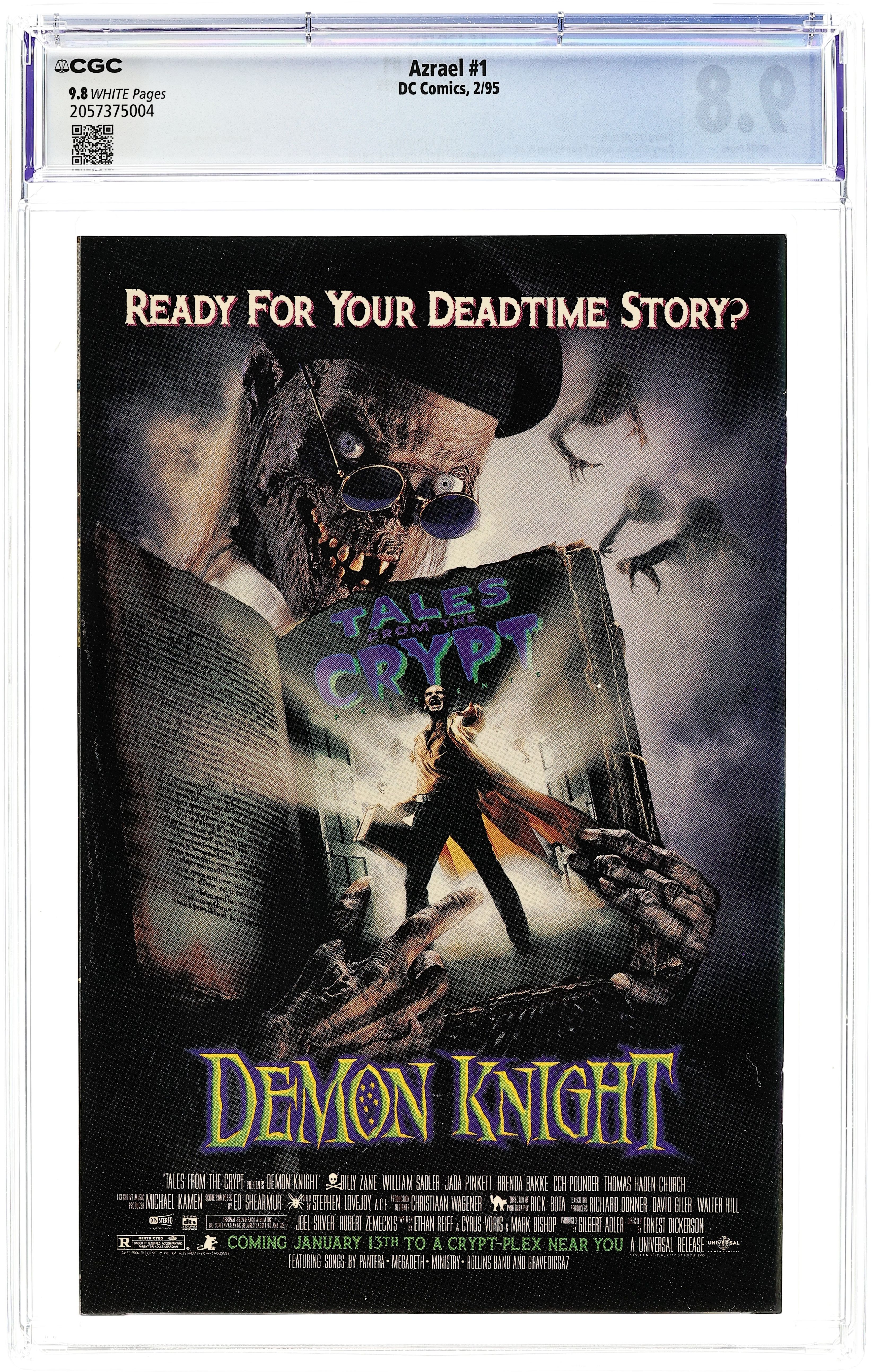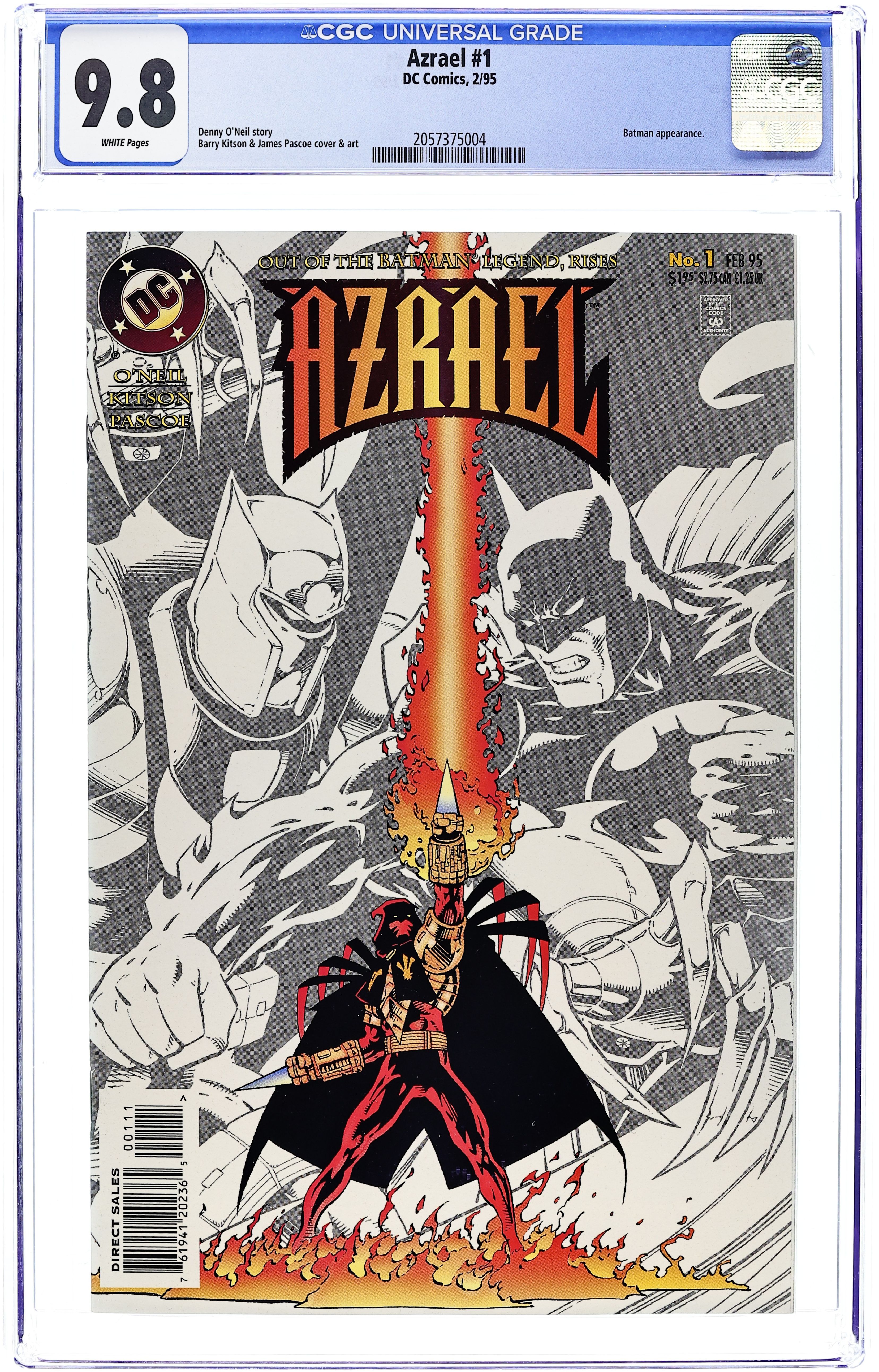 Fallen Angel: Part 1 of 7: Some say in Fire... - Written by Dennis O'Neil. Art and Cover by Barry Kitson & James Pascoe. He is a creature of fire and retribution, of violence and bloodlust. He is the angel of justice...and vengeance...and sometimes of death. But perhaps first and foremost, he is a tortured mortal man. Azrael is back. The fallen angel of 'KnightsEnd' returns in the ongoing series, back in his awesome original costume and forced by events he cannot control to resume the war he believed was over. In the wake of 'KnightsEnd,' Jean-Paul Valley -- the man who had been Batman -- has seemingly regained his sanity. Now broken and lost, Valley is still haunted by his disgrace and by nightmarish visions of the true Batman. His torment nearly blinds him to the dangers of the mean streets on which he lives, until circumstances trigger his life-long conditioning, forcing Azrael to the surface. Elsewhere, mysterious forces are swirling with designs on the avenging angel...including the Dark Knight himself! 32 pages, full color. Cover price $1.95.