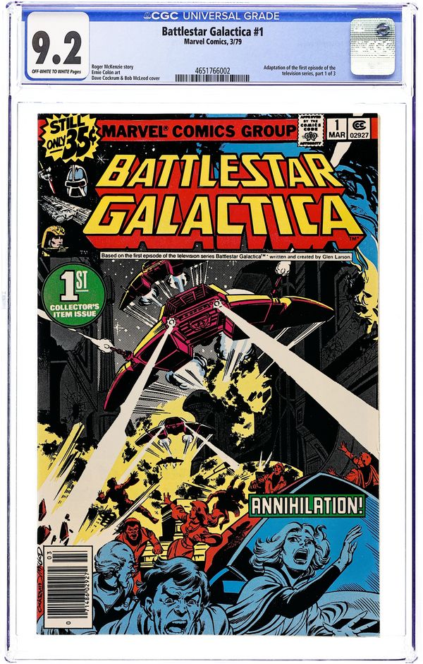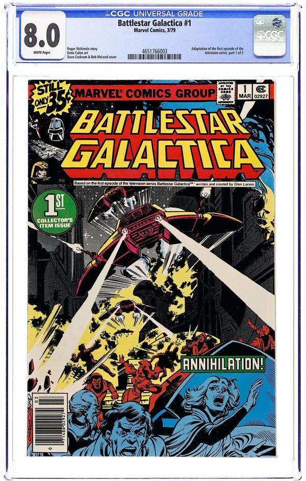 "Battlestar Galactica!" Based on the episode written by Glen Larson. Adapted by Roger McKenzie. Art by Ernie Colon. Cover by Dave Cockrum and Bob McLeod. In a distant time and place, a terrible war was waged between man and machine...the humans lost. Now, guided by their last surviving warship - the mighty Battlestar Galactica - a handful of survivors travel through space in search of the lost home of their ancestors, a shining planet known through ancient records, a planet called Earth. Cover price $0.35.