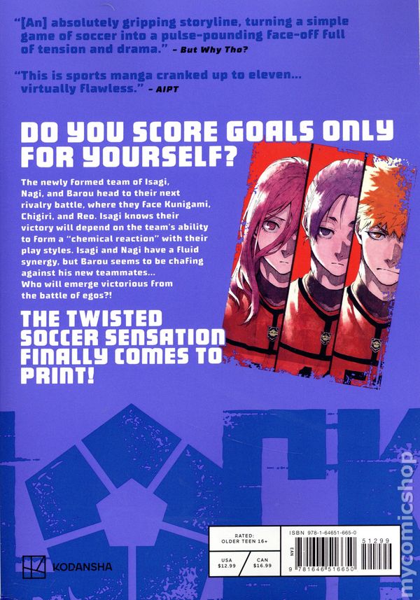 Volume 8 - 2nd and later printings. Written by Muneyuki Kaneshiro. Art and cover by Yusuke Nomura. The newly formed team of Isagi, Nagi, and Barou head to their next rival battle, where they face Kunigami, Chigiri, and Reo. Isagi knows their victory will depend on the teams ability to form a "chemical reaction" with their play styles. Isagi and Nagi have a fluid synergy, but Barou seems to be chafing against his new teammates… Who will emerge victorious from the battle of egos?! Softcover, 5 1/2-in. x 8-in., 192 pages, B&W. Older Teen 16+ Cover price $12.99.
