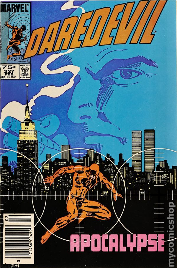 Direct Edition. First 75-cent cover price. Cover art by David Mazzucchelli. Apocalypse, script by Frank Miller, art by David Mazzucchel; Karen Page sells Daredevil's secret identity for a drug fix; Kingpin buys the name and proceeds to wreck Matt Murdock's life; part 1 of critically acclaimed Born Again storyline. 36 pgs. Cover price $0.75. Cover price $0.75.