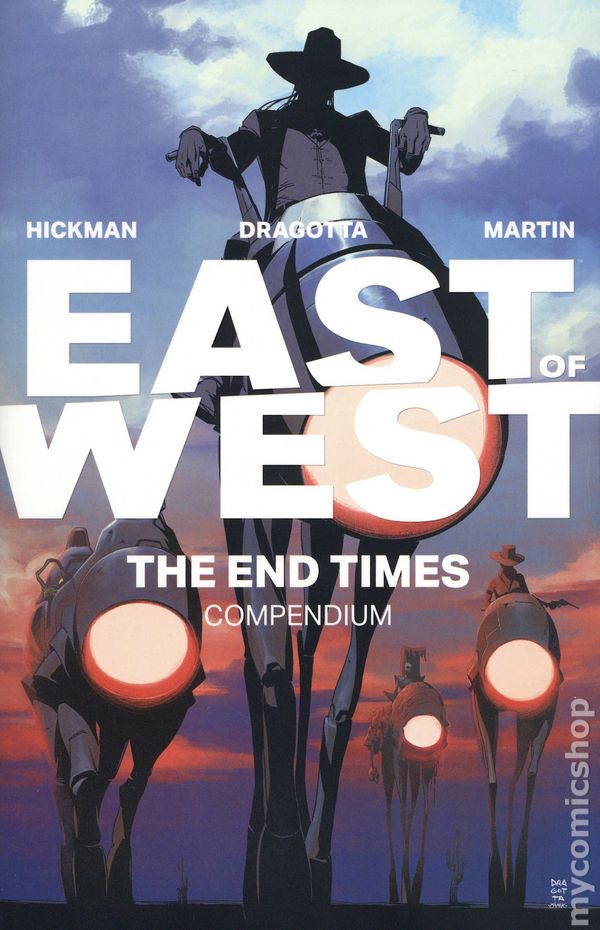 2nd or later printing. Collects East of West (2013-2019 Image) #1-45. Written by Jonathan Hickman. Art and cover by Nick Dragotta. This is the world. It is not the one we wanted, but it is the one we deserve. The Four Horsemen of the Apocalypse roam the Earth, signaling the End Times for humanity, and our best hope for life, lies in DEATH. Collecting all ten volumes of the critically acclaimed,_ New York Times_-bestselling series into one massive paperback, this compendium tells the entire story of the epic sci-fi/Western EAST OF WEST by writer JONATHAN HICKMAN and artist** NICK DRAGOTTA**. Softcover, 1,320 pages, full color. Teen+ Cover price $59.99.