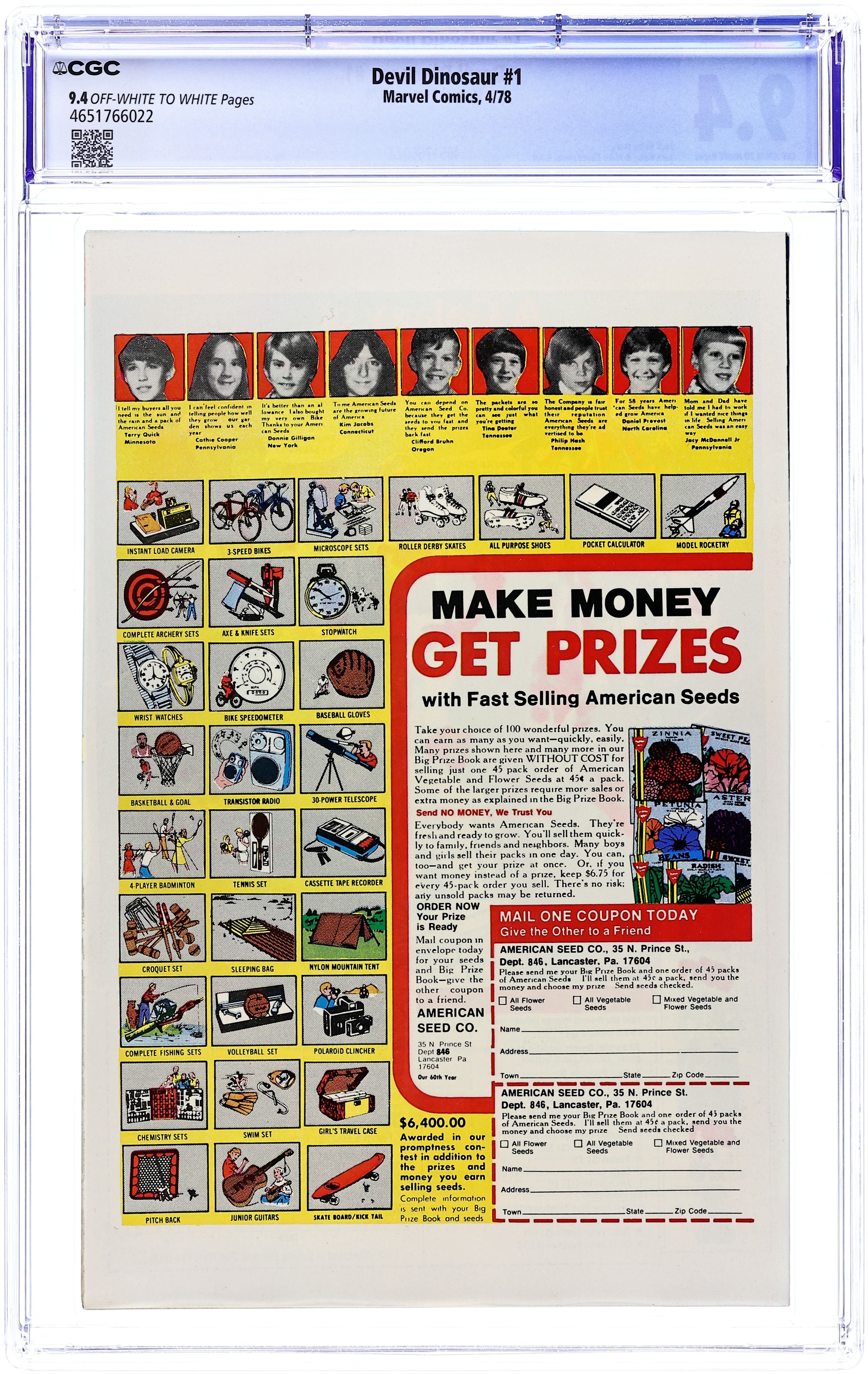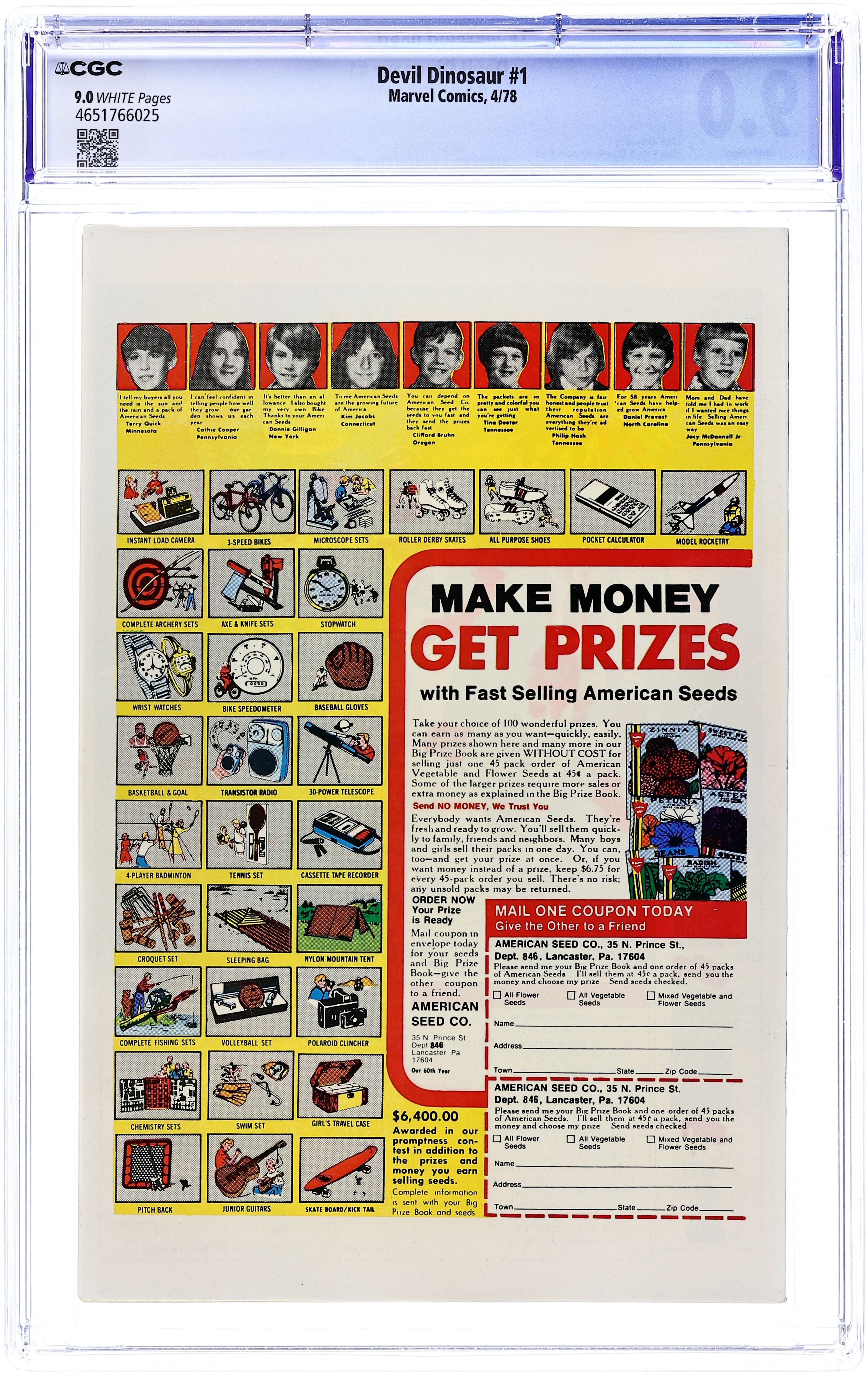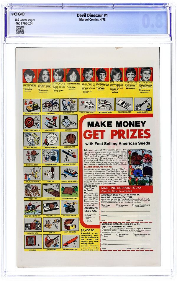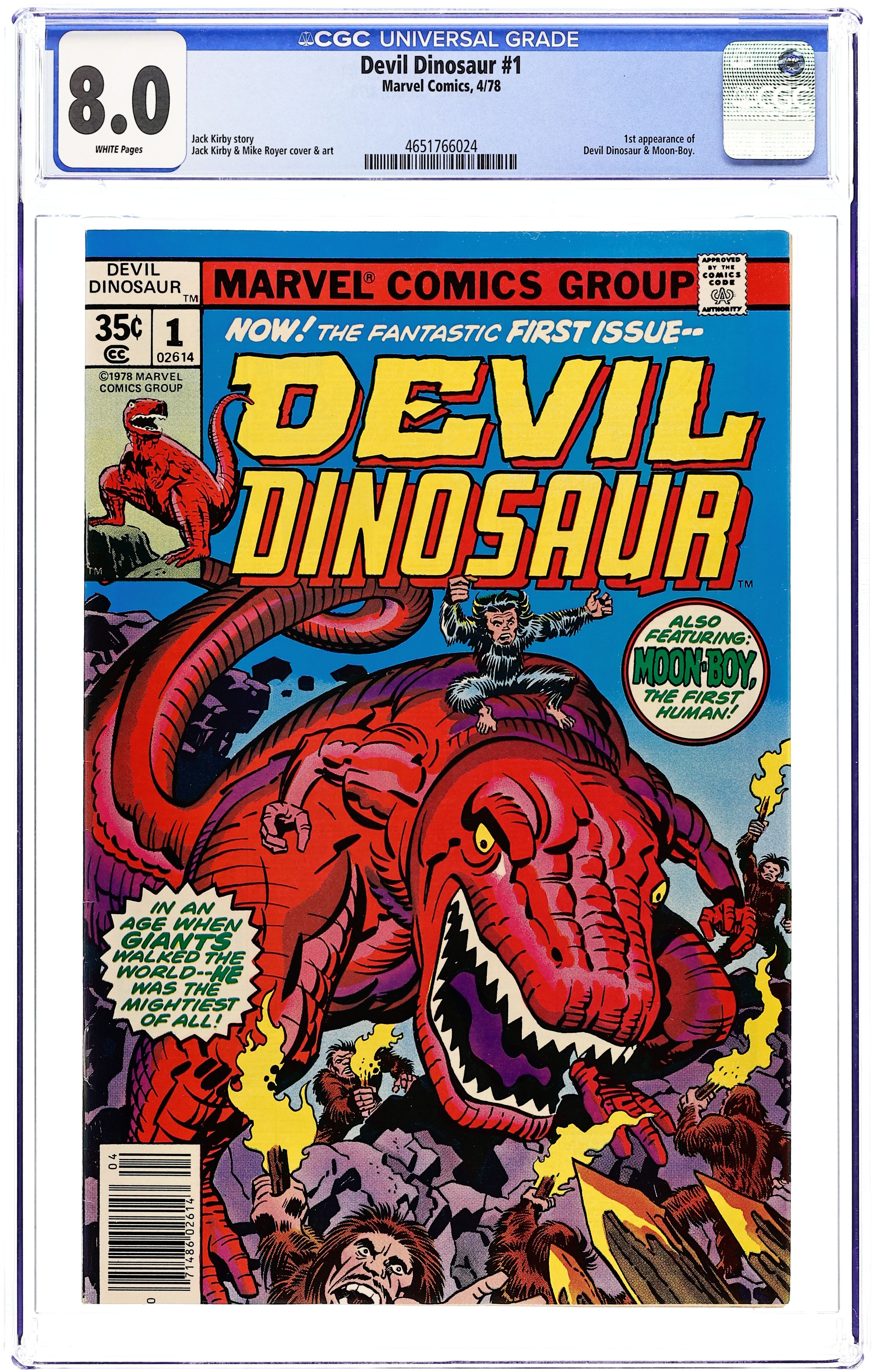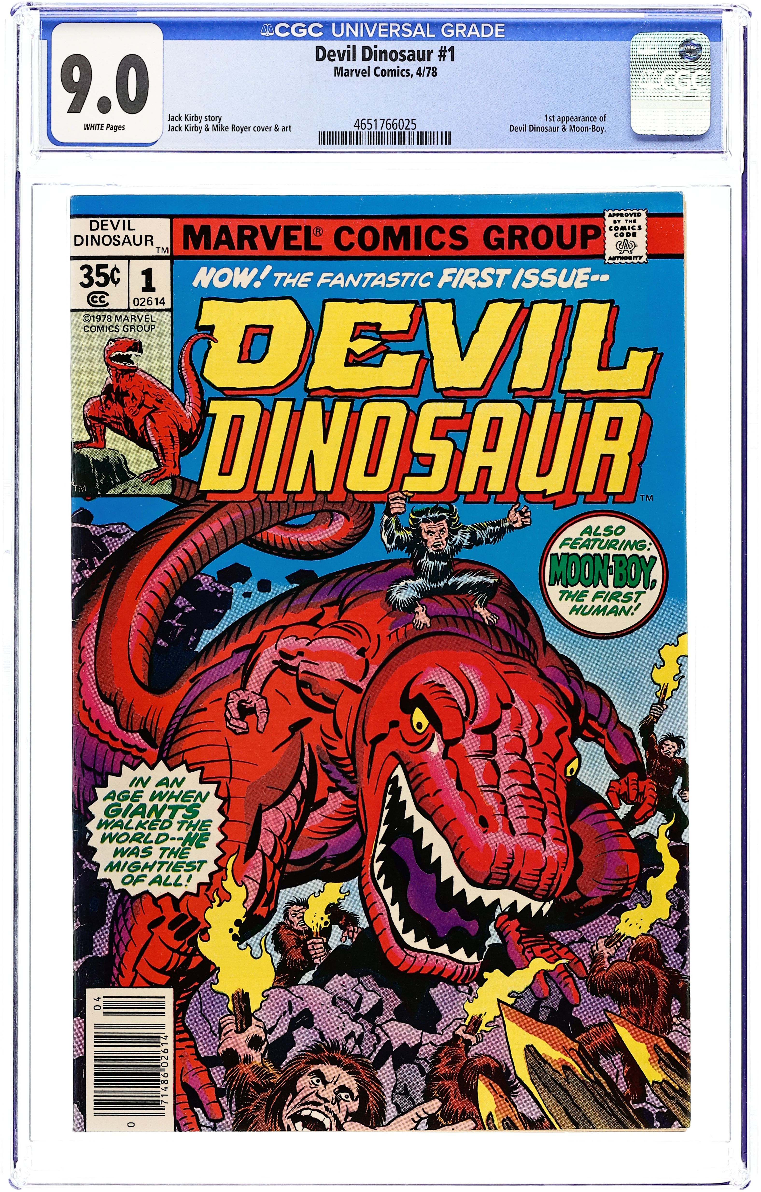 Cover pencils by Jack Kirby, inks by Frank Giacoia. Devil Dinosaur and Moon-Boy, script by Jack Kirby, pencils by Jack Kirby, inks by Mike Royer; Deep in the Valley of the Flame, Moon-Boy reveals the origins of Devil Dinosaur; Is the red-skinned and red-eyed Dino as menacing as the town-folk believe? 36 pgs., full color. $0.35. Cover price $0.35.