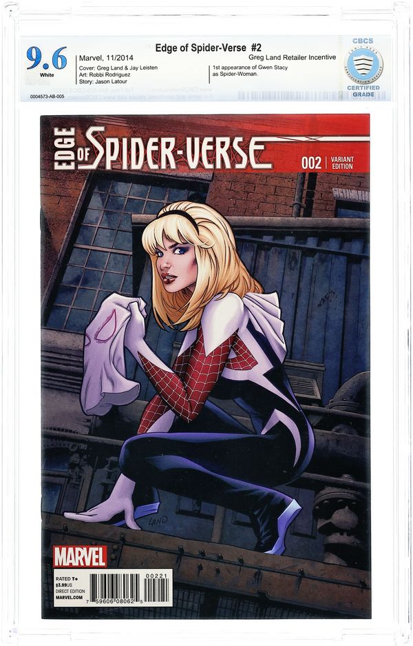 Limited 1 for 25 Retailer Incentive Variant Cover by Greg Land. Edge of Spider-Verse: Part 3 of 10 - Written by Jason Latour. Art by Robbi Rodriguez. GWEN STACY: SPIDER-WOMAN! • In one universe, it wasn't Peter Parker bitten by the radioactive Spider, but Gwen Stacy! She's smart, charming and can lift a car-- Just don't tell her Police Chief father! How is she involved in Spider-Verse? Seeds of AMAZING SPIDER-MAN #9 are planted here! 32 pages, full color. Rated T+ Cover price $3.99.
