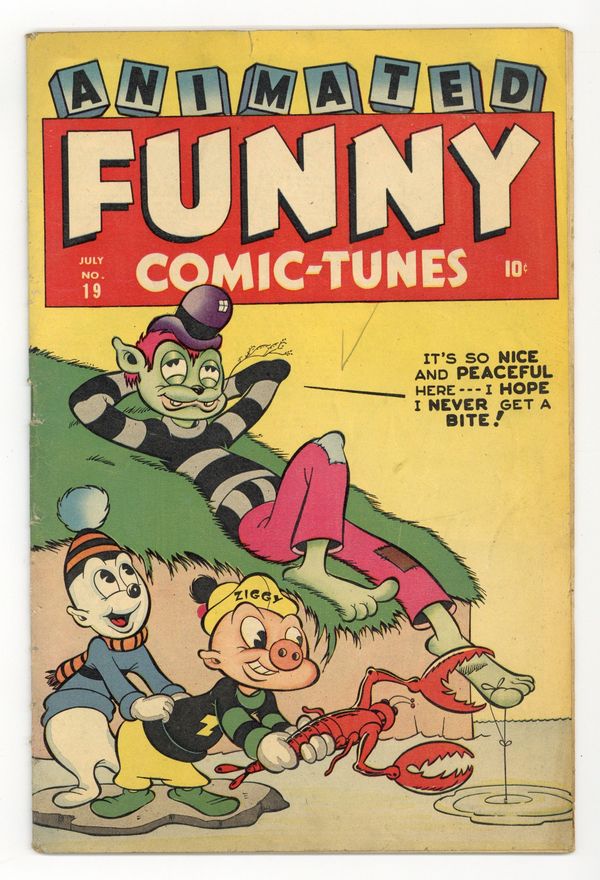 No cover price edition. Funny Animals Coloring Book (circa 1945) is an over-sized coloring book featuring Hoppy the Marvel Bunny and his cartoon friends. Sherlock Monk and Chuck the Duck investigate a crime at the circus; luckily, the thieves decided to hide in one of the lion cages. Also featuring a Hoppy story in which he is swallowed by a hungry wolf, but is able to transform into Captain Marvel Bunny while inside the wolf! Distributed by Fawcett Publications, Inc. 36 pages, B&W, 11-in. x 13-in.