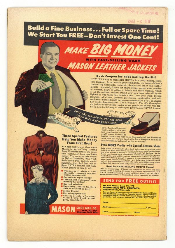 Cover art by Graham Ingels. Sucker Bait!--The Witch's Cauldron!, script by Albert B. Feldstein, art by Graham Ingels; After his father is killed by a vampire, a chemist comes up with a plan to sacrifice himself so that others may live. Lover, Come Hack to Me!--The Vault of Horror!, script by Albert B. Feldstein, art by George Evans; Every generation, a madwoman is conceived on the night of her parent's wedding who follows the tradition of murdering her newly-wed husband with an ax in the same house. Double-Header!--The Old Witch's Grim Fairy Tale!, script by Albert B. Feldstein, art by Jack Kamen. Foul Play!--The Crypt of Terror, script by Albert B. Feldstein, art by Jack Davis. 36 pgs. $0.10. Cover price $0.10.