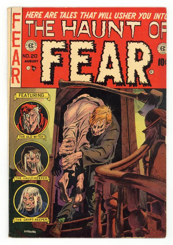 Cover art by Graham Ingels. Thump Fun!--The Witch's Cauldron!, script by Albert B. Feldstein, art by Graham Ingels; A murderer thinks he is like the character in Poe's "Tell-Tale Heart", imagining he hears a heartbeat in the walls, but after police examine the area they find his older brother's corpse. Terror Train--The Vault-Keeper's E.C. Classic, script and art by Albert B. Feldstein; Gloria was in a cab, running away from her husband Ralph...heading toward the train station and the train that would take her away from this man whom she thought was trying to poison her. Bloody Sure--Haunt of Fear, script by Albert B. Feldstein, art by Reed Crandall. Hyde and Go Shriek!--The Crypt of Terror, script by Albert B. Feldstein, art by Jack Davis. 36 pgs. $0.10. Cover price $0.10.