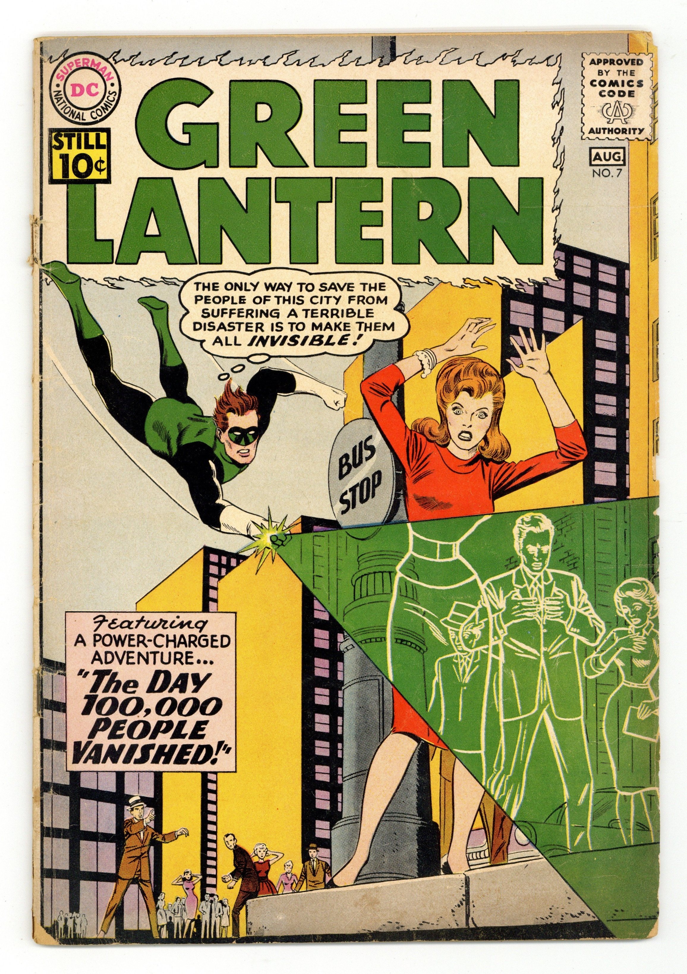 Cover pencils by Gil Kane, inks by Joe Giella. Buzzy Says: Free Speech -- Free For All! public service announcement, script by Jack Schiff, art by Win Mortimer. The Planet of Doomed Men, script by John Broome, pencils by Gil Kane, inks by Murphy Anderson; Hal Jordan's energy-duplicate is summoned by the Guardians for the first time. After he is returned to Earth the Guardians send him to Calor, a nearby planet, to save the Calorians from the ape-monster Dryg. Many Loves of Dobie Gillis ad, art by Bob Oksner. Menace of the Giant Puppet!, script by John Broome, pencils by Gil Kane, inks by Joe Giella; The Puppet-Master invents a Hypno-Ray and commits crimes using others as puppets, until he attempts to capture Green Lantern, who instead captures him. Meanwhile, Carol Ferris daydreams of marrying Green Lantern. Letter to the editor from comic writer Roy Thomas. 36 pages, full color. Cover price $0.10.