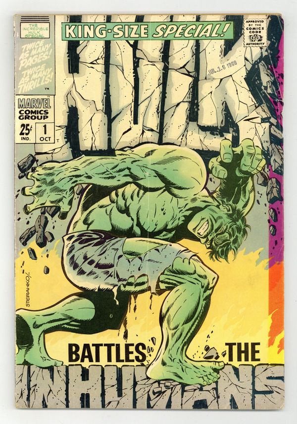 New story: the Hulk battles the Inhumans in "A Refuge Divided!" Script by Gary Friedrich, pencils by Marie Severin, inks by Syd Shores (and others). Jim Steranko cover (with the head redrawn by Severin). 68 pages, full color. Cover price $0.25.