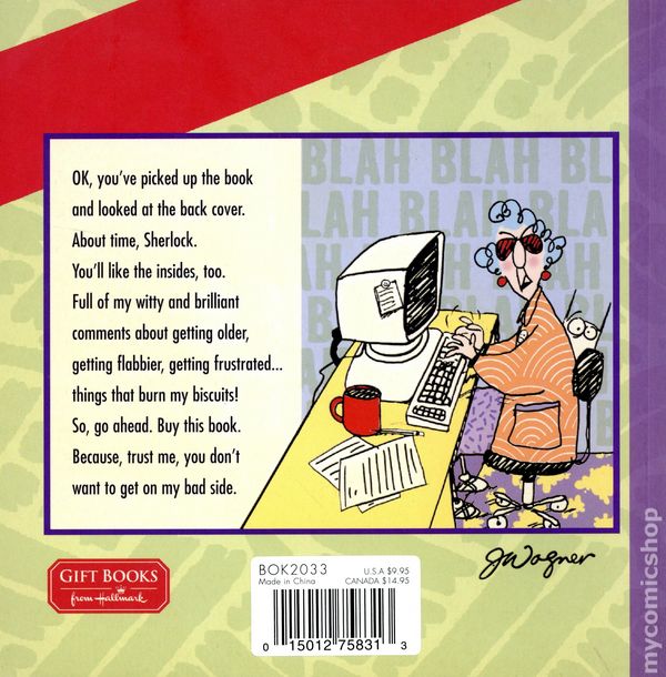 1st printing. By John Wagner. "Ok, you've picked up the book and looked at the back cover. About time, Sherlock. You'll like the insides, too. Full of my witty and brilliant comments about getting older, getting flabbier, getting frustrated... things that burn my biscuits! So, go ahead. Buy this book. Because, trust me, you don't want to get on my bad side." - Maxine Softcover, 7-in. x 7-in., 96 pages, PC/PB&W. Cover price $9.95.