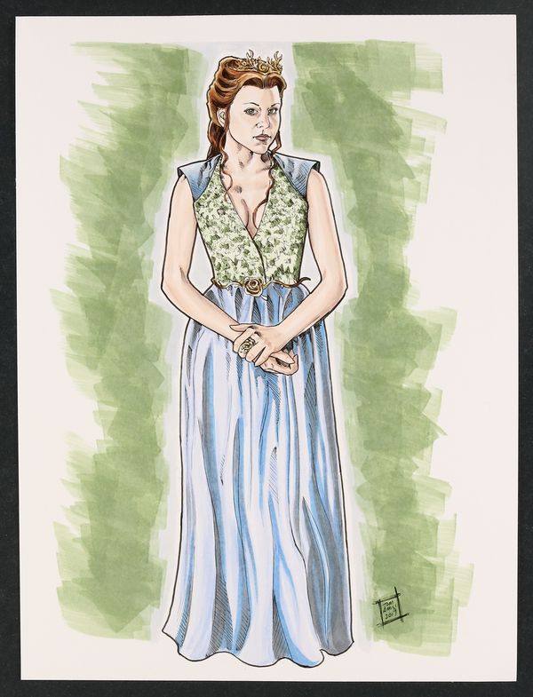 The daughter of the lord of High Garden looks elegant garbed in a flowing blue gown and the green and gold of her house. Pencil, ink, and alcohol marker on heavy stock. Signed by the artist. 9 7/8" X 12".