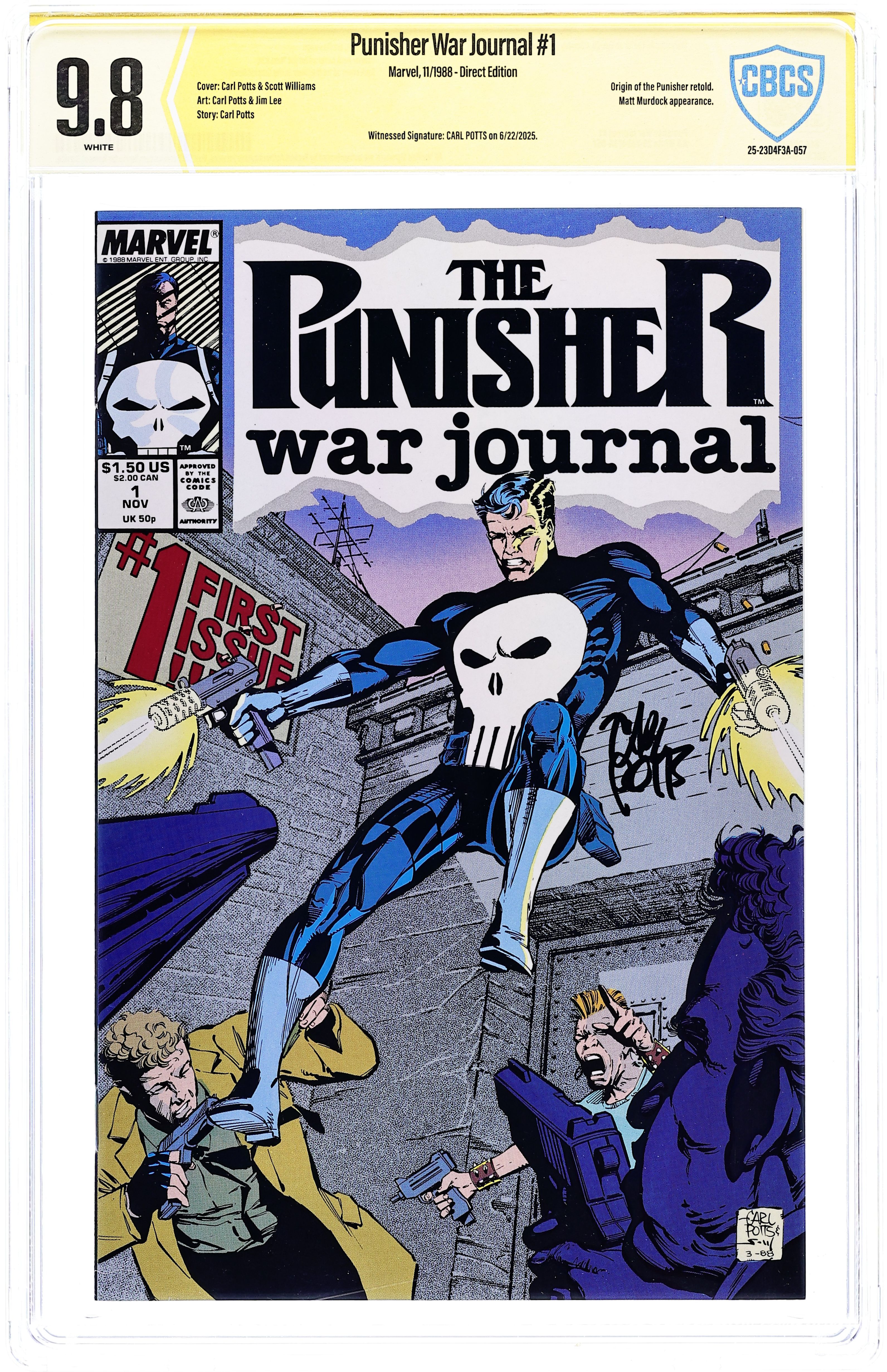 Direct Edition. Cover art by Carl Potts and Scott Williams. An Eye for an Eye Chapter One Sunday in the Park, script by Carl Potts, pencils by Carl Potts and Jim Lee, inks by Jim Lee; Punisher shoots some criminals and recalls his family's death in Central Park. Profiles of this issue's creators. 36 pgs. $1.50. Cover price $1.50.