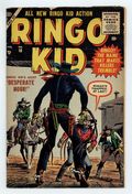 Cover art by Joe Maneely. Untitled story, art by Fred Kida; The Ringo Kid spots two bushwackers who are attempting to shoot at the local marshal who is bringing out his prisoner, a man named Lance from his jailhouse; The Kid is faster at the draw and his superior shooting skills allows him to shoot the guns out of the assassins hands, but they managed to flee the scene before they can be rounded up. "Ranch Hand's Luck" text story, art by Al Williamson. "Duel At Dawn," art by Fred Kida; The Ringo Kid is riding along a mountain pass when he comes across a man hanging on for dear life on the remains of a collapsed rope bridge; With the help of his horse Arab, the Ringo Kid swings down and pulls the man to safety; The old man thanks the Kid for his help and introduces himself as Matt Carmody, the circuit judge for the district. "Calico Pony," art by Fred Kida; The Ringo Kid is in a saloon refilling his canteen when a young boy rushes in asking for help; The Kid tries to calm the boy, when suddenly a man comes bursting in and demands that the boy give up his Calico pon. "The Stranger!", script by Stan Lee, art by Dick Ayers. "Freeze Or Fight," art by Fred Kida; Arriving in the town of Bowstring, the Ringo Kid finds the sheriff and his posse waiting for him; The sheriff tells the Kid that the only way he will allow him into town, with his reputation, is if the Kid agrees to turn over his guns; With no choice, the Ringo Kid agrees and turns over his guns; He is spotted by two men named Lobo and Zack who decide to get a reputation for themselves even though the Ringo Kid does not have any guns on him. 36 pgs., full color. Cover price $0.10.