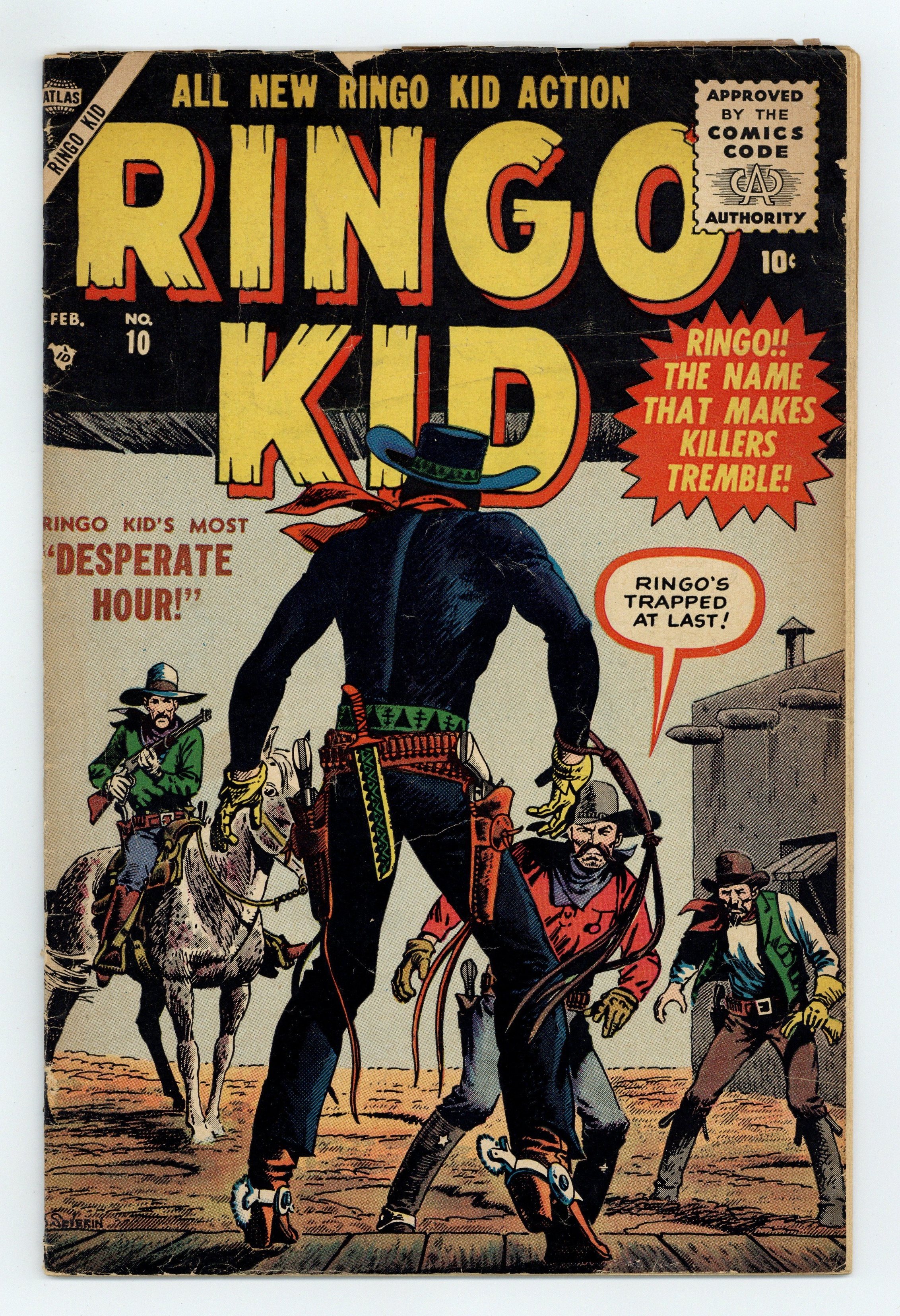 Cover art by John Severin. "The Hostage," art by Fred Kida; While riding across the range the Ringo Kid realizes that he is being followed and puts on a chase; Unsure if he is dealing with lawmen or not, the Kid jumps up into a nearby tree and sends Arab ahead to lead his pursuers on a wild goose chase; As the men pass by, he recognizes one of them as an outlaw named Blackjack Kane, but notices that they are wearing sheriff stars. "Trail of Thunder" text story. "The Poachers!", art by Fred Kida; The Ringo Kid comes to the aid of his friend Dull Knife who has been tied up by and places on his horse by a gang of poachers led by a man named Tarlowe; The Kid sends Tarlowe and his men into fleeing and frees Dull Knife; He learns from his friend that Tarlowe and his men have been poaching buffalo on Comanche land which threatens to send the Comanches on the warpath. "Desperate Hour!", art by Fred Kida; The Ringo Kid is camping out for the night when he is suddenly interrupted by Sheriff Gil Ransom, who has not come to arrest the Ringo Kid, but to ask for his help; He explains that his sixteen year old son Joe idolizes the Ringo Kid and wants to become an outlaw. "Stranger in Town!", script by Stan Lee, art by Al Williamson and Angelo Torres. "One Must Die!", art by Fred Kida; The Ringo Kid is riding along the rang when he hears a gunshot and goes to investigate; He comes across a man standing over a dead body and gets the drop on him; Refusing to let the shooter go, the Kid searches the dead man and finds a warrant written by Marshal Cameron to arrest Buzzard Brady for murder and take him to Yuma prison. 36 pgs., full color. Cover price $0.10.