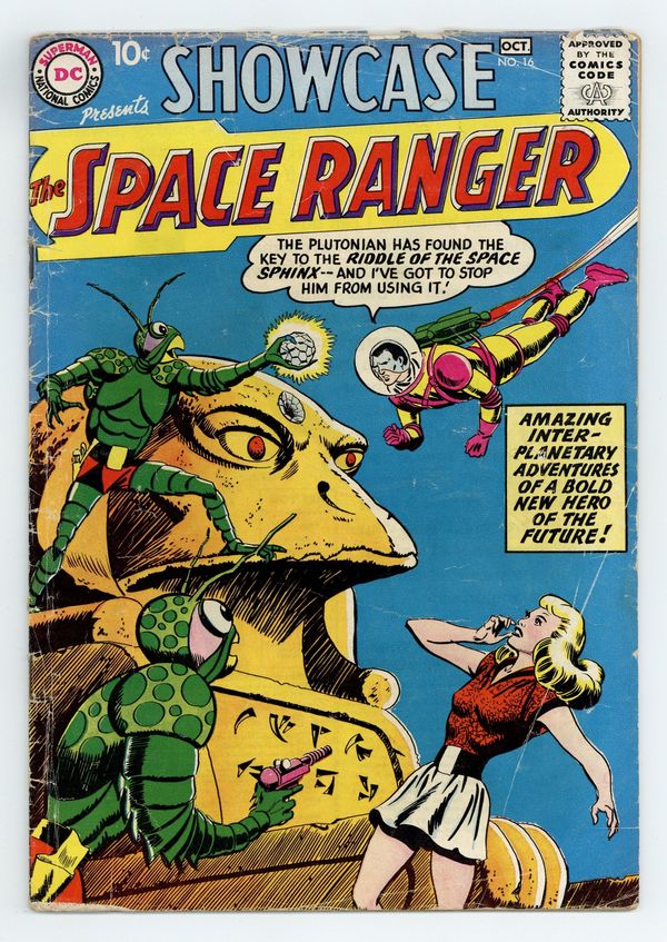 2nd appearance of Green Lantern. Cover and interior pencils by Gil Kane, cover and interior inks by Joe Giella. Summons from Space!; Green Lantern travels to Venus to save a blue-skinned caveman-like race from attack by yellow Pterodactyl-like creatures. The Invisible Destroyer!; When Dr. Phillips is distracted, The Invisible Destroyer is released from his mind. Scripts by John Broome. 36 Pages, Full Color. Cover price $0.10.