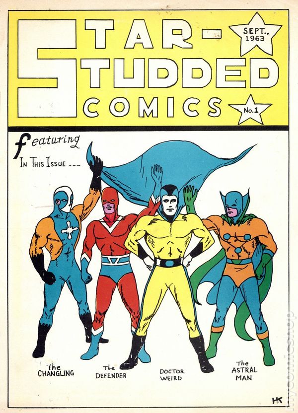 Star-Studded Comics 1 - September 1963 (Following content information for this issue, see a "Brief History of Star-Studded Comics" written by Rick Kelsey) Format: Four-color photo offset for cover and ditto interior Staple bound on side of pages. Original price was 35 cents Color cover by Howard Keltner features the Changling, the Defender, Doctor Weird, and the Astral Man. This was the first color cover EVER for a fandom-produced publication. "Let's Talk It Over!" column with notes and discussion by the Texas Trio. Stories:"The Defender in Slaves of the Brain Ray" A text story by Larry Herndon and illustrations by Richard "Grass" Green "Introducing Dr. Weird" Comic story with script and art by Howard Keltner "The Astral Man" A text story by Tommy Fisher "The Changling In Fearfull [sic] Weapon!" Comic story with script and art by Buddy Saunders A BRIEF HISTORY OF STAR-STUDDED COMICS by Rick Kelsey THE BEGINNING: On February 15, 1963, three young men who loved comic books met at a Carrollton, Texas home to talk about the hobby and the possibility of starting their own comic book. They did just that. The comic was called Star-Studded Comics and those three young men, Larry Herndon, Howard Keltner, and Buddy Saunders, became the "Texas Trio." When the "Texas Trio" started Star-Studded Comics in the early 1960s, it was an exciting time in comic books. New heroes and new teams were premiering like Spider-Man, the Fantastic Four, Magnus Robot Fighter, the Justice League of America. And old heroes were being revived like the Flash, Green Lantern, and Captain America. This was a time before VCRs, DVDs, CD-Roms, personal computers, and cellular phones and when checking your mail meant looking in the mailbox in front of your home not turning on the computer and logging onto the internet. Even comic books stores didn't exist. You got the latest issues of Batman, Superman, the Hulk, or Donald Duck from wire racks in convenience stores, drug stores, grocery stores, and the "five-and-10" shops such as Winn's, Ben Franklin's, and TG&Y. And comic book conventions weren't happening yet. All of that helped to make the entertainment value of comic books all the greater and all the more precious. Fans wanted to meet one another and one way to do that was to publish your own comic book or magazine. Many tried but few succeeded as well as "Star-Studded Comics." The problem? A fan-published comic or magazine didn't usually last or appear with the regularity and dependability of a professional comic. Many fan publications ended or went AWOL after one issue. If you think self-publishing today is a tough job, imagine doing that in the 1960s without computers, desktop publishing software, word processing programs, Fax machines, photo-copiers, a home printer, the internet, or even an electric typewriter. Then toss in the fact that there was little, if any, profit to be made publishing your own comic or magazine. So you couldn't make a living from that. Most of these fan publications were done out of the love of the hobby. And when all of your spare time from your job or school is spent working on a comic or mag, your enthusiasm and dedication can quickly fade. Yet, the "Texas Trio" published 18 issues of Star-Studded Comics and in its time became well-known among fans and professionals alike, gave many future comic writers and artists a start in the industry, and entertained many, many people. And today the comic is a collectors' item and a reminder of a wonderful time when comic books were one of the best entertainment sources and a great escape for youngsters. If you want to know more about the history of Star-Studded Comics and the super-heroes, villains, stories, and artwork that appeared in this publication, check out the book "The Best of Star-Studded Comics" by Bill Schelly which is available at the author's website www.billschelly.com Cover price $0.35.