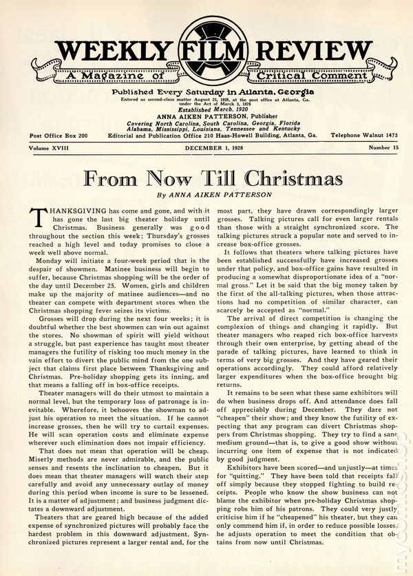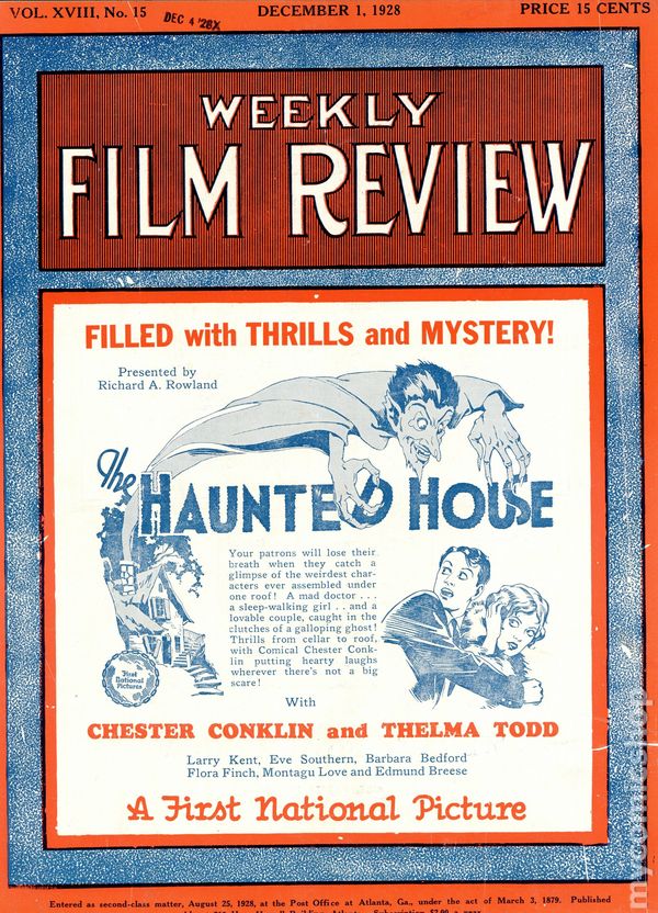 Weekly film magazine for theater owners in the American South. Includes film reviews and industry news. This issue features a contemporary review by publisher Anna Aiken Patterson of Disney's first sound film, "Steamboat Willie". Released on November 18, 1928, this complementary review is less than two weeks later. Also includes photos of Lon Chaney in "West of Zanzibar" with a mention of his upcoming film, "Where East Is East", directed by Tod Browning (Dracula, Freaks). 9" x 12", 24 pages, B&W. Cover price $0.15.