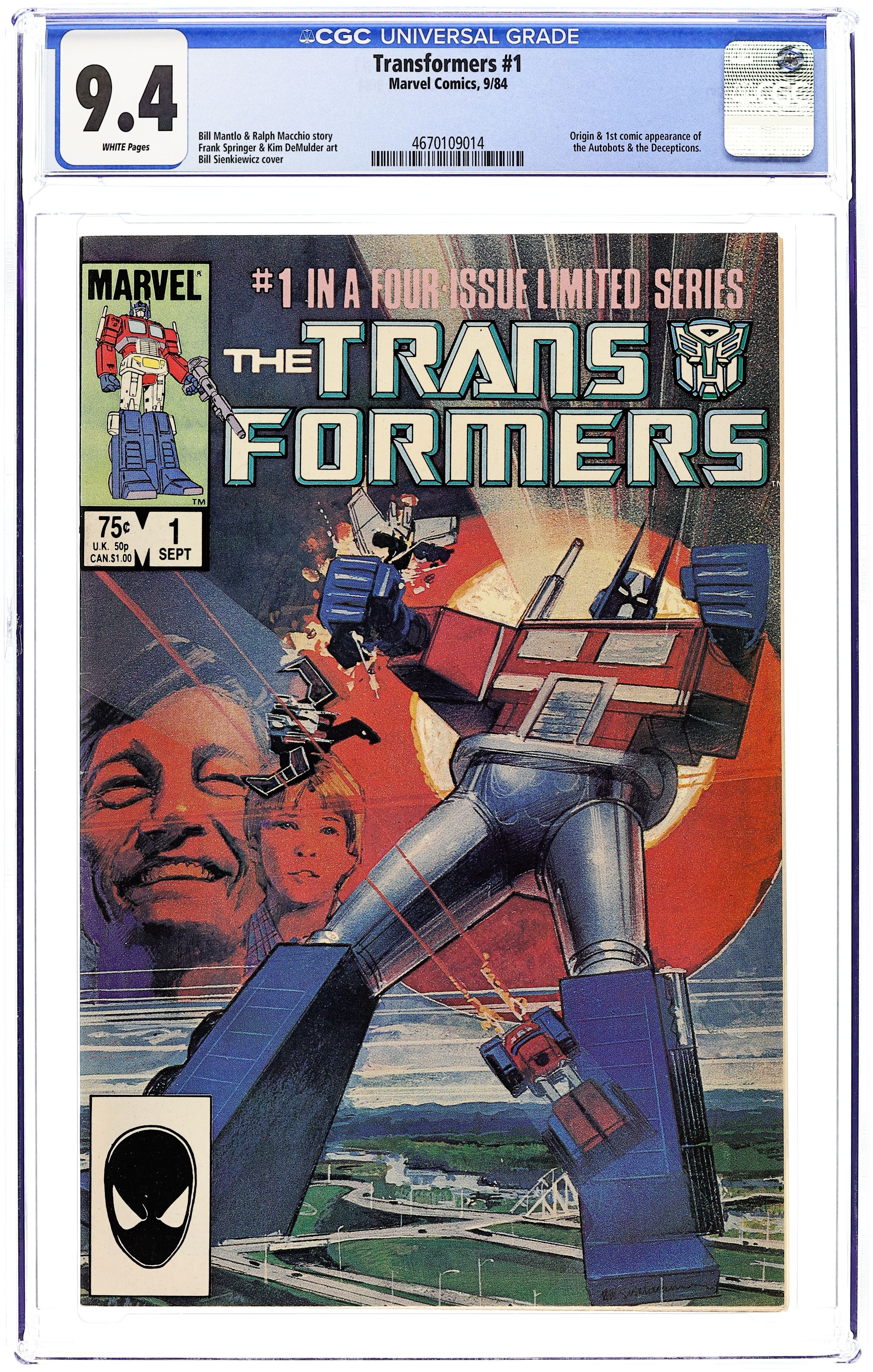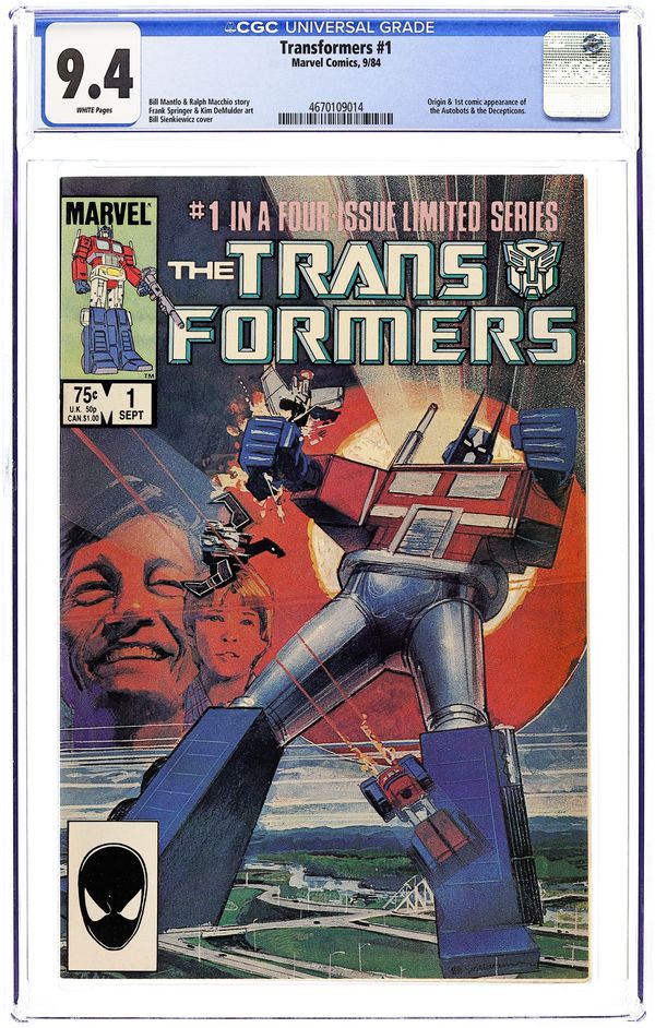 Direct Edition. "The Transformers!" Part 1 of 4. Story by Bill Mantlo and Ralph Macchio. Pencils by Frank Springer. Inks by Kim DeMulder. Cover by Bill Sienkiewicz. Based on the extremely popular toyline and cartoon from the early eighties. For centuries, deep in space, on the techno-organic planet of Cybertron, a war has raged. This battle between the benevolent and peace loving Autobots, led by the heroic Optimus Prime, and the malevolent militaristic Decepticons, led by the dangerous Megatron, has now spilled over to the planet Earth. These Robots in Disguise will continue their eternal struggle and mankind is now caught in the middle. NOTE: This series was originally intended to be a four issue limited series. This is a first printing. All 2nd or 3rd printings have a 2nd, 3rd printing notice on inside at bottom of indicia on first/splash page. 2nd printings were done for most issues from #1 to #9. Cover price $0.75.