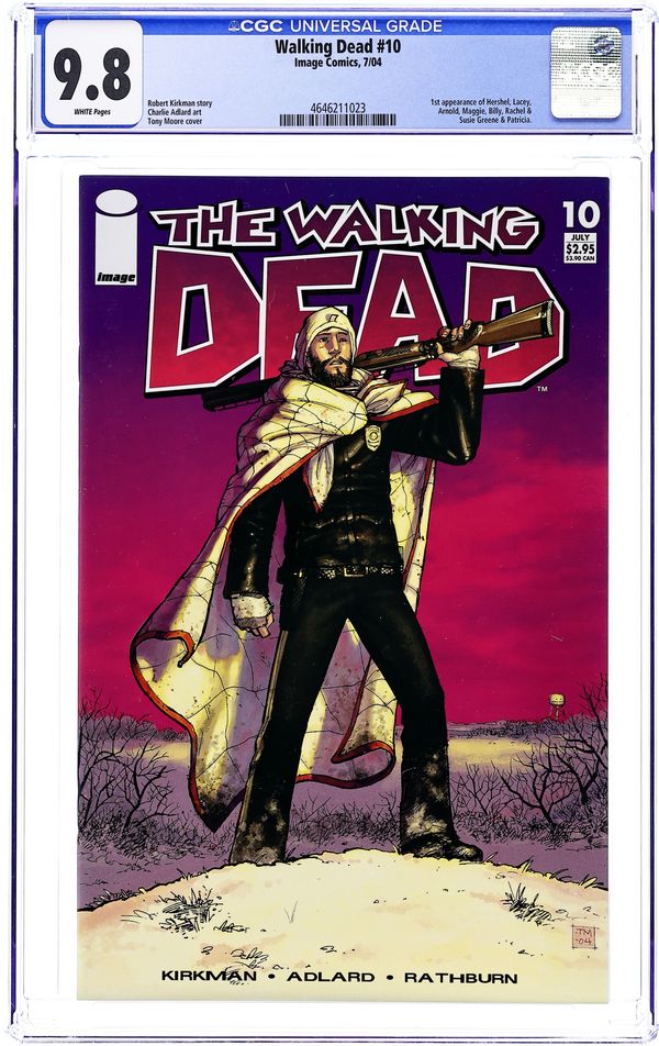 Black & white, 32 pages written by ROBERT KIRKMAN art by CHARLIE ADLARD cover by TONY MOORE MATURE READERS WARNING CONCEPT: An epidemic of apocalyptic proportions has swept the globe, causing the dead to rise and feed on the living. In a matter of months society has crumbled: There is no government, no grocery stores, no mail delivery, no cable TV. In a world ruled by the dead, we are forced to finally begin living. THIS ISSUE: Rick snaps. Cover price $2.95.