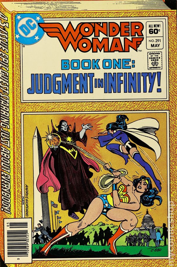 Cover pencils by Ross Andru, inks by Dick Giordano. "Comes the Adjudicator!" (Judgment in Infinity Chapter 1), script by Paul Levitz (plot) and Roy Thomas (script), pencils by Gene Colan, inks by Frank McLaughlin; Wonder Woman seeks the help of her Justice League comrades when a powerful alien giant comes to test Earth's worthiness as a planet. "Horsemen Four!" (Judgment in Infinity Chapter 2), script by Paul Levitz (plot) and Roy Thomas (script), pencils by Gene Colan, inks by Frank McLaughlin; Wonder Woman and Zatanna travel to Calcutta, India, where they battle the Adjudicator's first Horseman - Famine. Statement of ownership - average print run 230,591; average paid circulation 82,202. 36 pages, Full Color. Cover price $0.60.