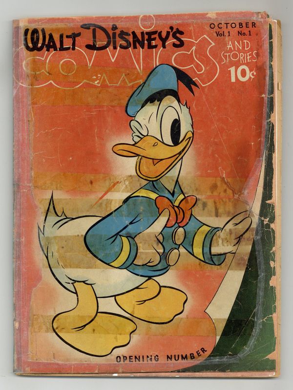 Cover by Hank Porter. Stories and art by Floyd Gottfredson, Ted Thwaites, Al Taliaferro, Ferdinand Horvath, Homer Brightman, Ted Osborne, Merrill De Maris, Bob Wright, Tom Wood and Hank Porter. Sometimes listed as Vol. 1, #1. The long-running vehicle for Disney character comics featured early work by Carl Barks, the legendary Good Duck Artist. In a classic Floyd Gottfredson story from the Mickey Mouse comic strip, Mickey and Goofy meet Professor Einmug, who has created a floating island haven in the sky. But when Pegleg Pete gets wind of it, Mickey sees trouble ahead. In another Gottfredson story, Mickey plays Robinson Crusoe in a movie. A ventriloquist teaches Pluto to talk, or so it seems. The Robber Kitten; Just One Thing After Another; Billboard Artist; Following a Tip on the Market!; Oh, Nuts!; True To Form; I Bite - Do You?; Donald Duck Follows Through!; Ducky Housecleaning; Clarabelle's Dinner Talks; A Ticklish Rescue; Water Babies; Pie a la Donald; A Hallowe'en Puzzle; Mickey's Hints; Tack-sy! Taxi!; Bullied!; Hook, Line And Succor!; A Cagey Finish!; Mr. Mouse Takes a Trip; Donald's Got a Girl!; Chalk It Up; Donald Fights to the Finish; He Got It in the End!; Donald Was Game - So Was Horace!; Robinson Crusoe. 64 pages, Full Color. Cover price $0.10.