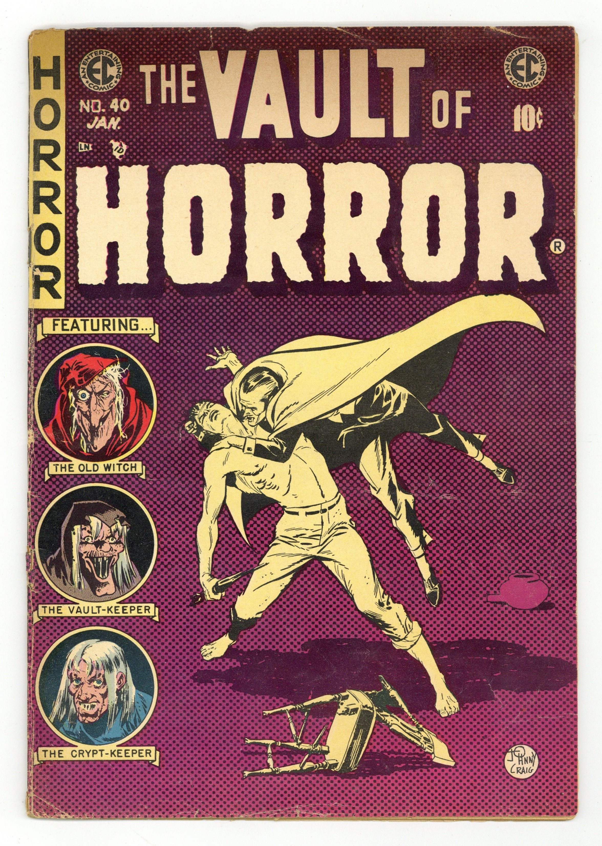 Cover by Johnny Craig. Ad for Panic. "Twin Bill!", script and art by Johnny Craig; Larry stood there in the dark, sweating profusely, waiting for them to come: his wife and her lover. He remembered the night he caught them in each other's arms... how he made them take shovels and forced them to dig their grave. "Witch Witch's Witch!", script by Johnny Craig, art by Jack Davis; Eric came home to Blumstedt with his new wife... who was not the girl to whom he had been betrothed since childhood. "Cooler" text story. "Pipe Dream," script by Johnny Craig, art by Bernie Krigstein; Chen begins his tale while frequenting an opium den, a place where he can have drug-induced dreams that give him power and importance. "Two-Timed!", art by Graham Ingels (as Ghastly); It was 1900 and little Dickie lay in his bed until he heard a sound he thought was his Mom and Dad returning home; Instead it came from outside, and he followed the sound until he saw a man viciously beating a woman to death. 36 pgs., full color. $0.10. Cover price $0.10.