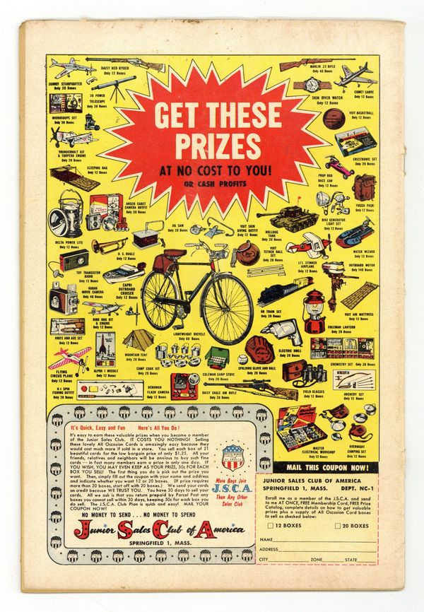 Cover pencils by Curt Swan, inks by Stan Kaye. The Boy From Outer Space! starring Superman and Batman, script by Edmond Hamilton, pencils by Dick Sprang, inks by Stan Kaye; A mysterious boy with Super-powers crash lands on Earth; Superman takes him in, but Batman suspects he's a criminal. Lem n' Lime humor two-pager by Henry Boltinoff. The Indian Cannoneers starring Tomahawk, art by Fred Ray. Varsity Vic humor page by Henry Boltinoff. World At Your Fingertips text article about stamp collecting. Marauders from the Deep starring Green Arrow, art by George Papp; Green Arrow has to fight crime under water. Wanted: A Teen-Age Code public service announcement, script by Jack Schiff, art by Ruben Moriera. 36 Pages, Full Color. Cover price $0.10.