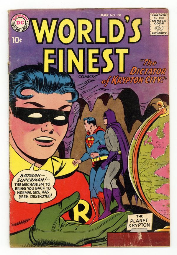 Cover pencils by Curt Swan, inks by Stan Kaye. Batman's Super Spending Spree, script by Bill Finger, pencils by Dick Sprang, inks by Stan Kaye; Batman announces he is going to spend a million dollars; When his purchases turn out to be busts, Superman secretly makes them profitable, against Batman's wishes. Lem 'n' Lime humor two-pager by Henry Boltinoff. Crime Under Glass starring Green Arrow, script by Robert Bernstein, pencils by Jack Kirby, inks by Jack Kirby and Roz Kirby; Green Arrow and Speedy take down a gang of robbers using lenses in their crimes. The Frontier Rogues Gallery starring Tomahawk, art by Fred Ray. Odd News Items, script by Julius Schwartz, pencils by Morris Waldinger, inks by Tommy Nicolosi; before 1870, newspapers were not equipped with folding devices. 36 Pages, Full Color. Cover price $0.10.