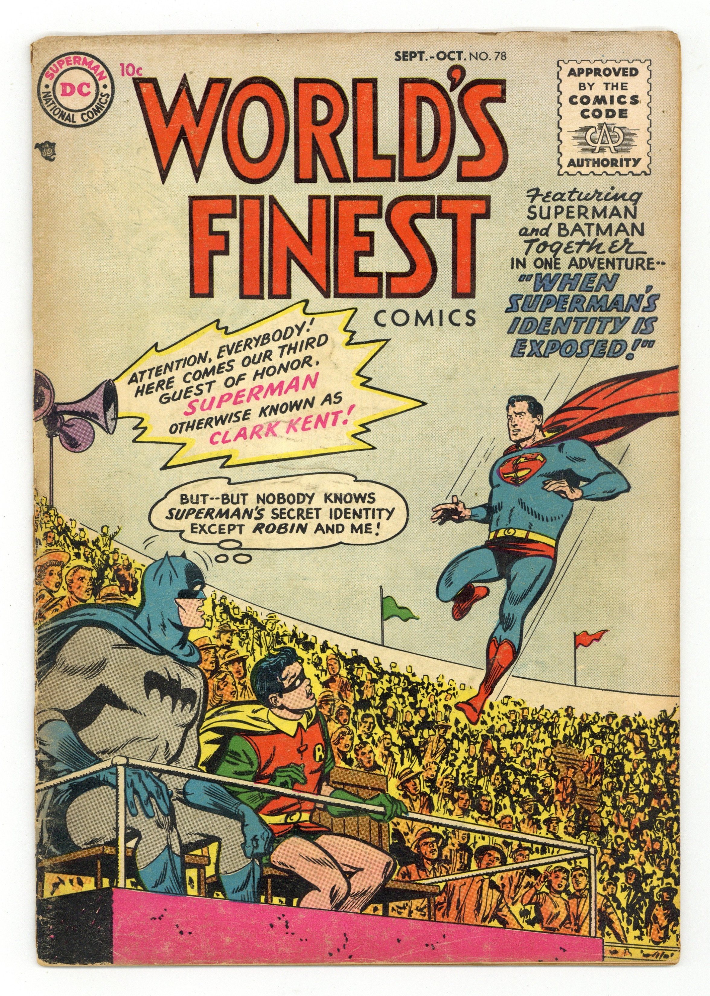 Cover art by Winslow Mortimer. The Superman Pageant, art by Al Plastino; Famed silent film director Karl Kruger stages a comeback with a pageant starring a Superman robot- but at the last minute Superman has to take the robot's place. Peg humor page by Henry Boltinoff. The Man Who Held Up Brooks Express starring Green Arrow, art by George Papp; Green Arrow and Speedy have to break a code hidden in a roll of coins. The House that Haunted Northville starring Tom Sparks, Boy Inventor. Canyon of Whirling Death starring the Wyoming Kid, script by Gardner Fox, art by Howard Sherman. Varsity Vic humor page by Henry Boltinoff. Most Mysterious Treasure in the World text article. The Crimes in Double starring Batman, script by David Vern, pencils by Dick Sprang, inks by Charles Paris. Private Pete humor page by Henry Boltinoff. Share With Others public service announcement starring Superboy, script by Jack Schiff, art by Win Mortimer. 68 Pages, Full Color. Cover price $0.15.