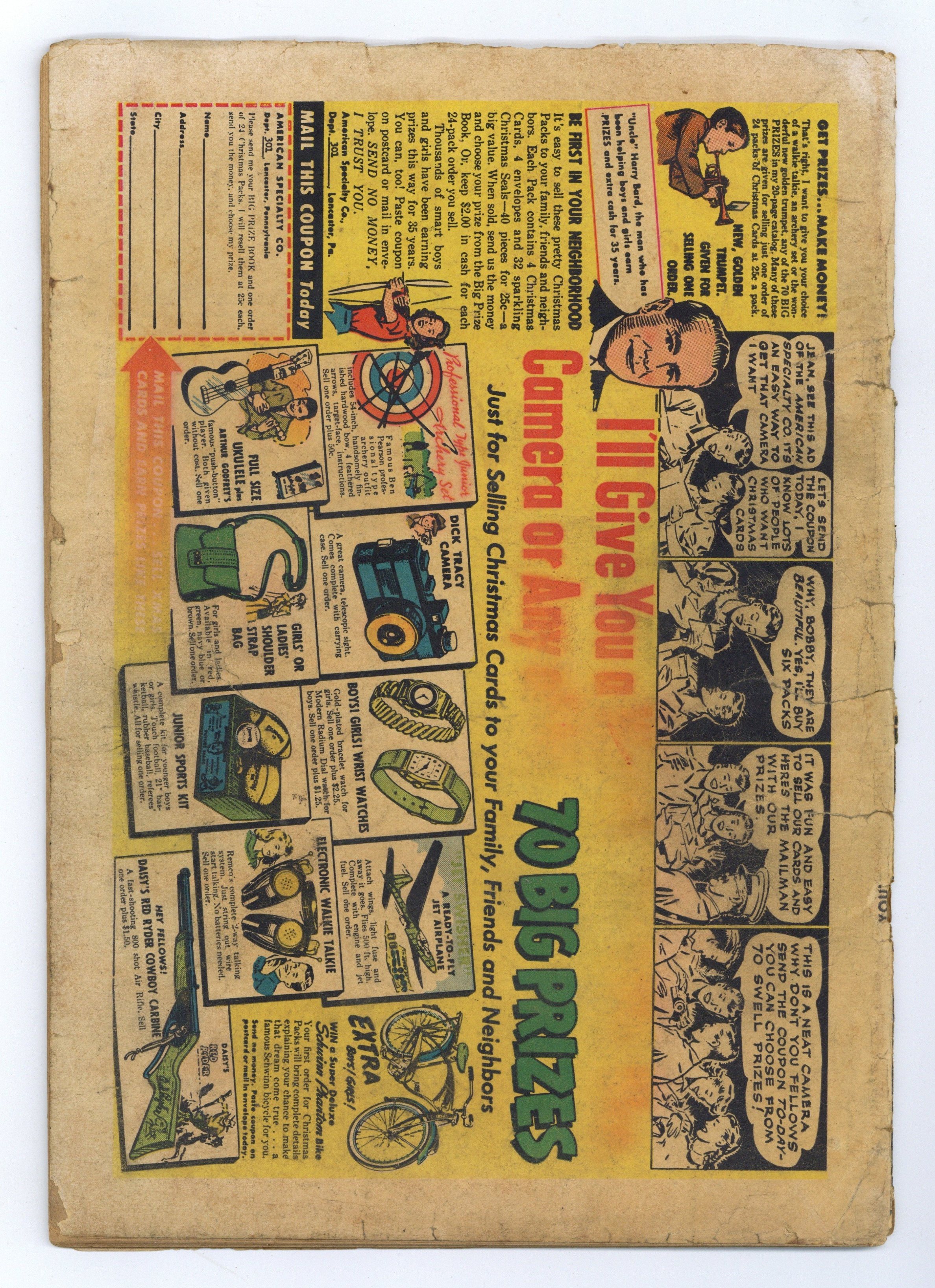 Cover art by Harry Sahle. "The Gruesome Twosome," art by Irv Novick; Steel buys two small jinxed goblin figurines that brings him trouble and bad luck. "The Zoot Suits," script by Ed Goggin, pencils by Harry Sahle, inks by Terry Szenics; Banana and Stencho have received reward money and spend it on clothes and women. "The Password," script by Ed Goggin, pencils by Harry Sahle, inks by Terry Szenics; The revenue men only get gas to drink. "Honor Among Thieves" text story by George Wellington. "Three Rounds With Gorilla Gus," art by Ed Robbins (as Robin); Red Rube signs up for a boxing match against Gorilla Gus to earn 500 dollars to help a lady and her blind son to an operation. "Seven Weeks of Hard Luck," script and art by Joe Edwards; Bigge Jinx has got an order from Pluto in Hades to deliver seven weeks of hard luck to Chimp for breaking his crystal ball. "A Day In the Country," script by Ed Goggin, art by Claire Moe; Piddle, Grump and the students are taking a day off in the country, without Ginger. "Vines Camp," script by Ed Goggin, art by Lin Streeter; School activities at Vines Camp with Wilbur as Councilor. 60 pgs., full color. Cover price $0.10.