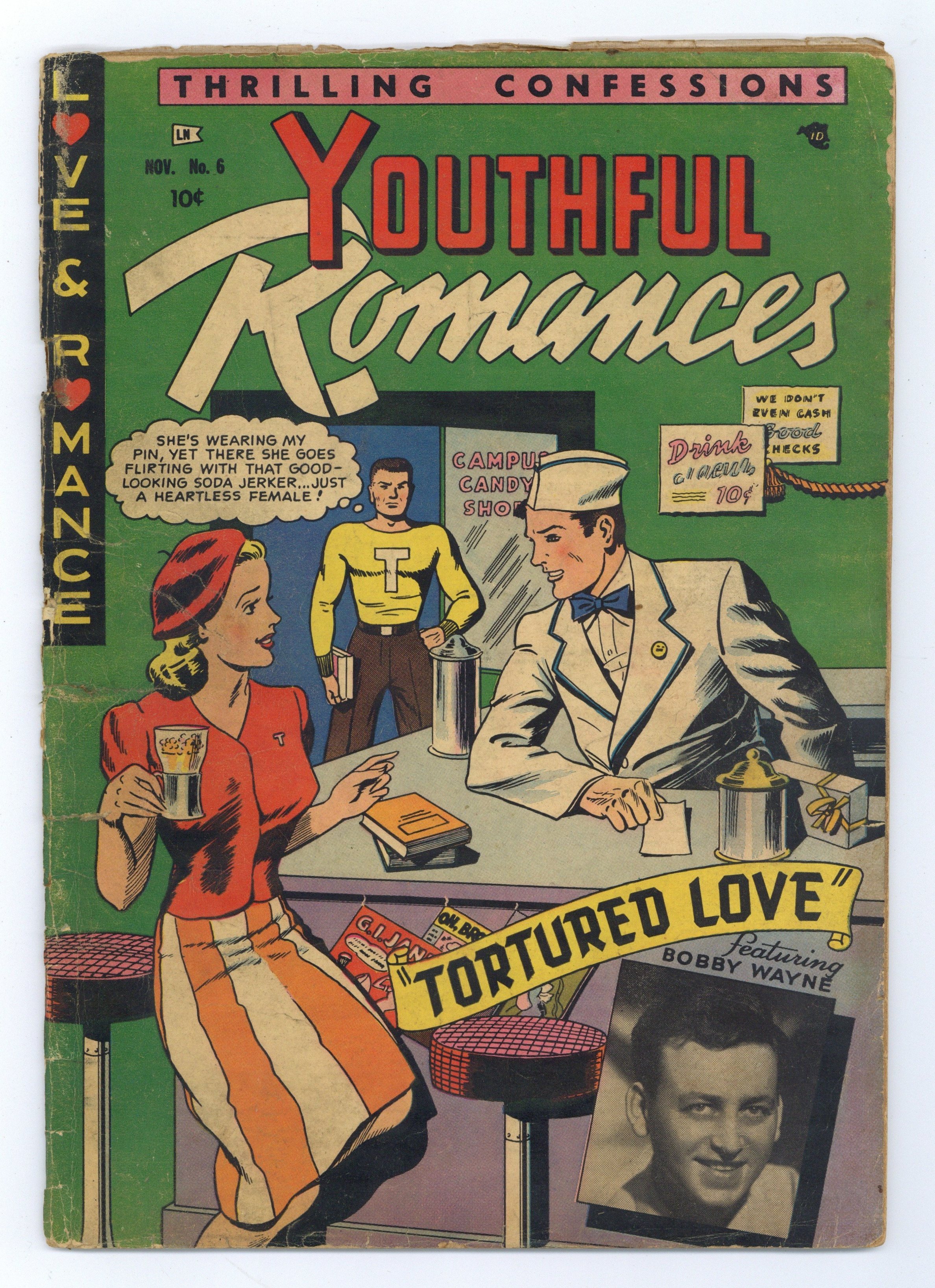 Cover by Ray McClelland. Stories and art by Bob Correa, Charles Tomsey, Ed Thursland and Alvin Hollingsworth. Tales of love and heartbreak, with a twist: in-story appearances by real-life musicians of the era. Redheaded Jeanie fears that her beau Steve is secretly a "dope peddler," until they get a little help from real-life singer Bobby Wayne. Fiercely protective of the family name, Lynn acts rashly when she learns her redheaded younger sister is dating an ex-convict. Redheaded Bette loves Barry, the sensitive artist she models for, but wealthy playboy Jed colors outside the lines. Plus a profile of Hollywood legend Debbie Reynolds, including a photograph, from early in her career. Cover features a photo of Les Paul and Mary Ford. Tortured Love; Hearts Will Find a Way; Artist and Model; Debbie Reynolds: Sparkler from Texas; Deep in Romance. 32 pages, Full Color. Cover price $0.10.