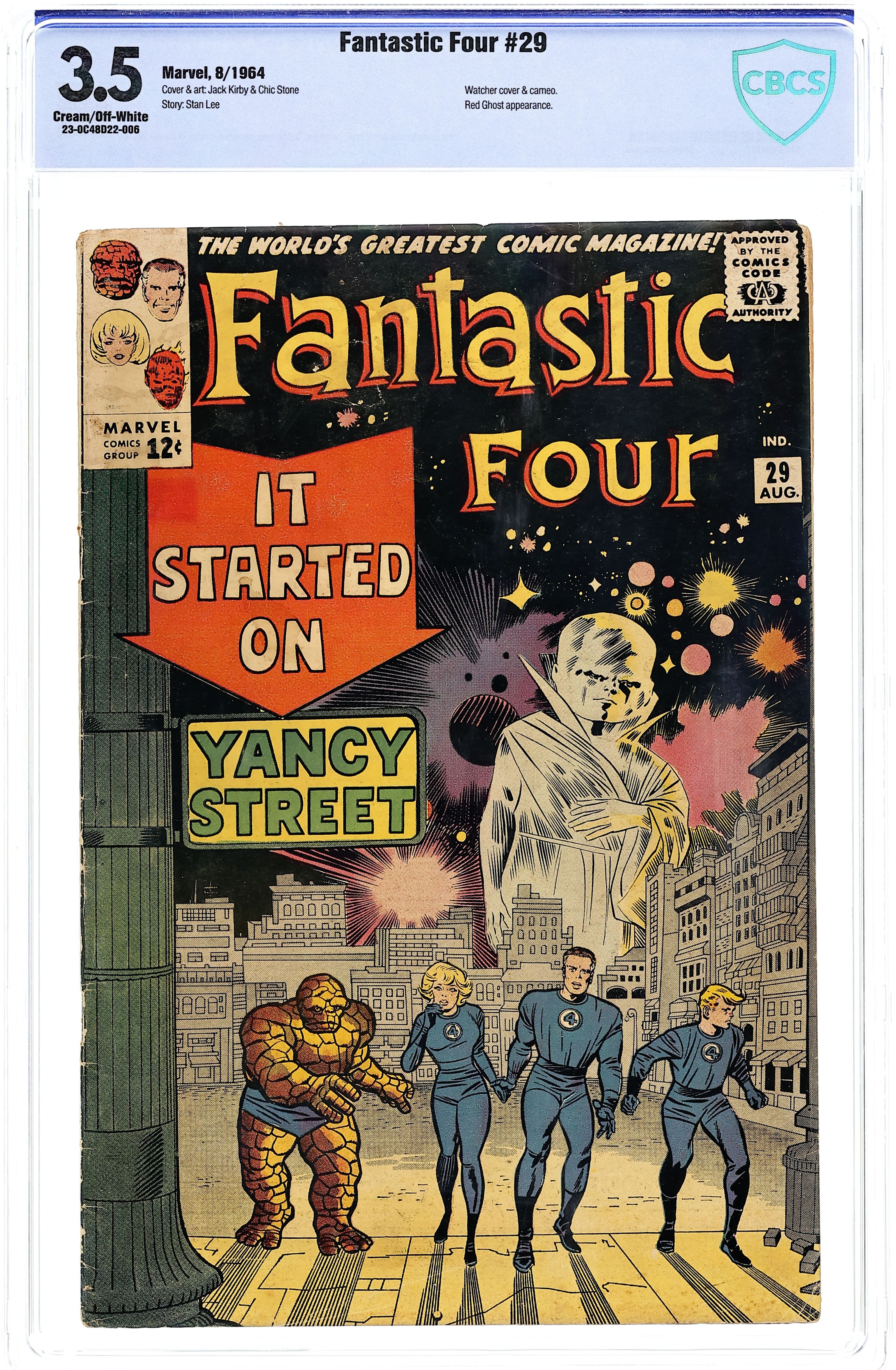 Starts Feb 16 Cover pencils by Jack Kirby, inks by Chic Stone. It Started on Yancy Street!, script by Stan Lee, pencils by Jack Kirby, inks by Chic Stone; the FF run from the jeers and pranks of the Yancy Street Gang; the FF battles the Red Ghost; the Super Apes take off in FFs ship, leaving them abandoned; the Watcher returns them home. Cameos by the Puppet Master, the Mole Man, the Super-Skrull, the Miracle Man, Doctor Doom, the Sub-Mariner, and the Mad Thinker. 36 pgs. $0.12. Cover price $0.12.