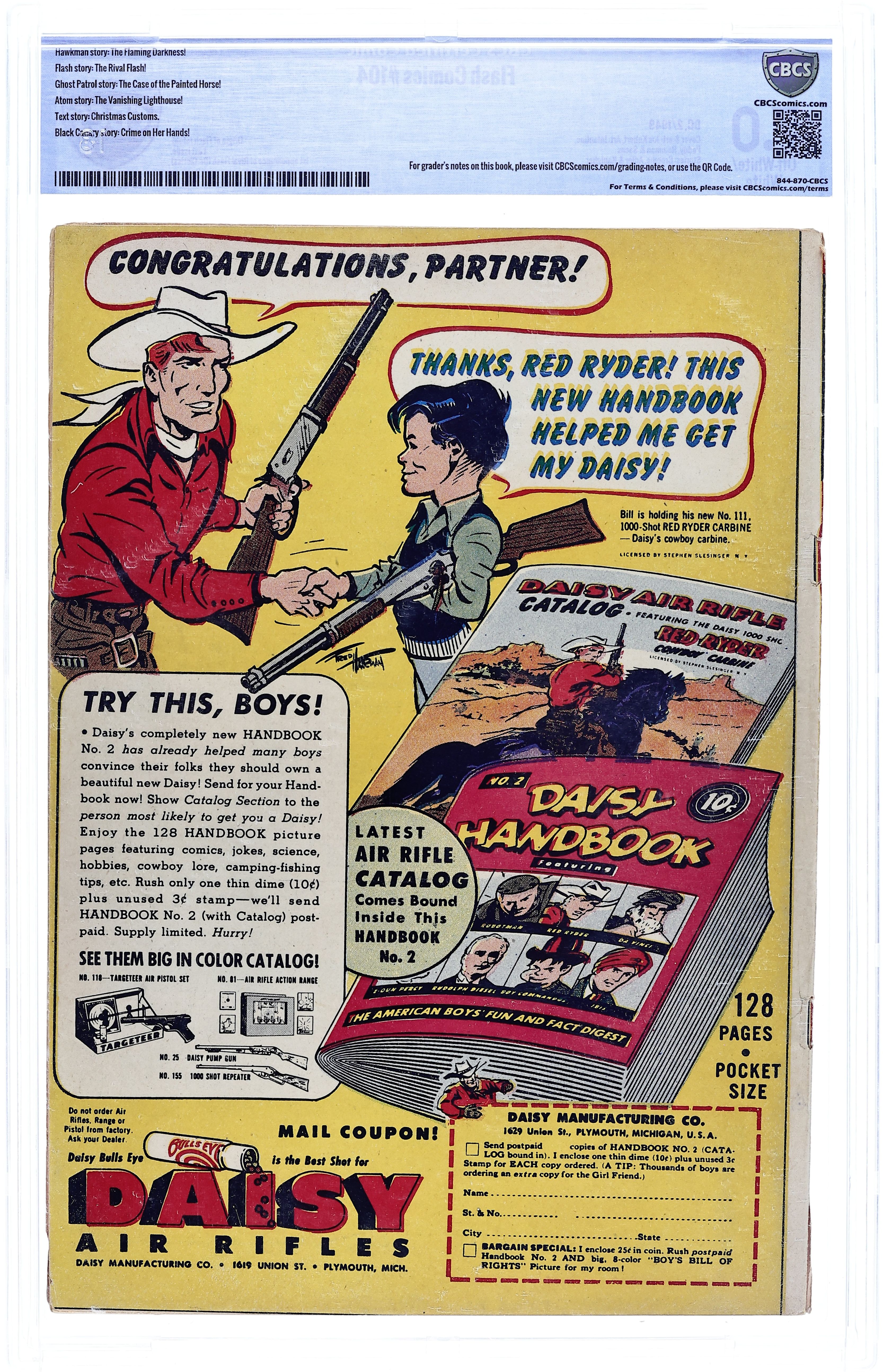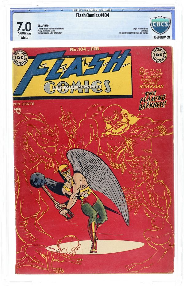 Flash stars in "The Rival Flash," written by Robert Kanigher, pencils by Carmine Infantino, inks by Frank Giacoia. Also includes: Ghost Patrol in "The Case of the Painted Horse" with pencils by Infantino, inks by Bernard Sachs; Black Canary in "Crime on Her Hands" by Kanigher, pencils by Infantino, inks by Sachs; Atom in "The Vanishing Lighthouse" written by Arthur Adler, art by Paul Reinman; Ma Nature's Curiosity Shop humor by Martin Naydel; and Hawkman in "The Flaming Darkness" by Broome and Joe Kubert. Cover art by Joe Kubert. This was the last issue in the Golden Age Flash series, but it picked up with issue #105 to begin the Silver Age of comics, with Barry Allen in the starring role. 52 Pages, Full Color. Cover price $0.10.