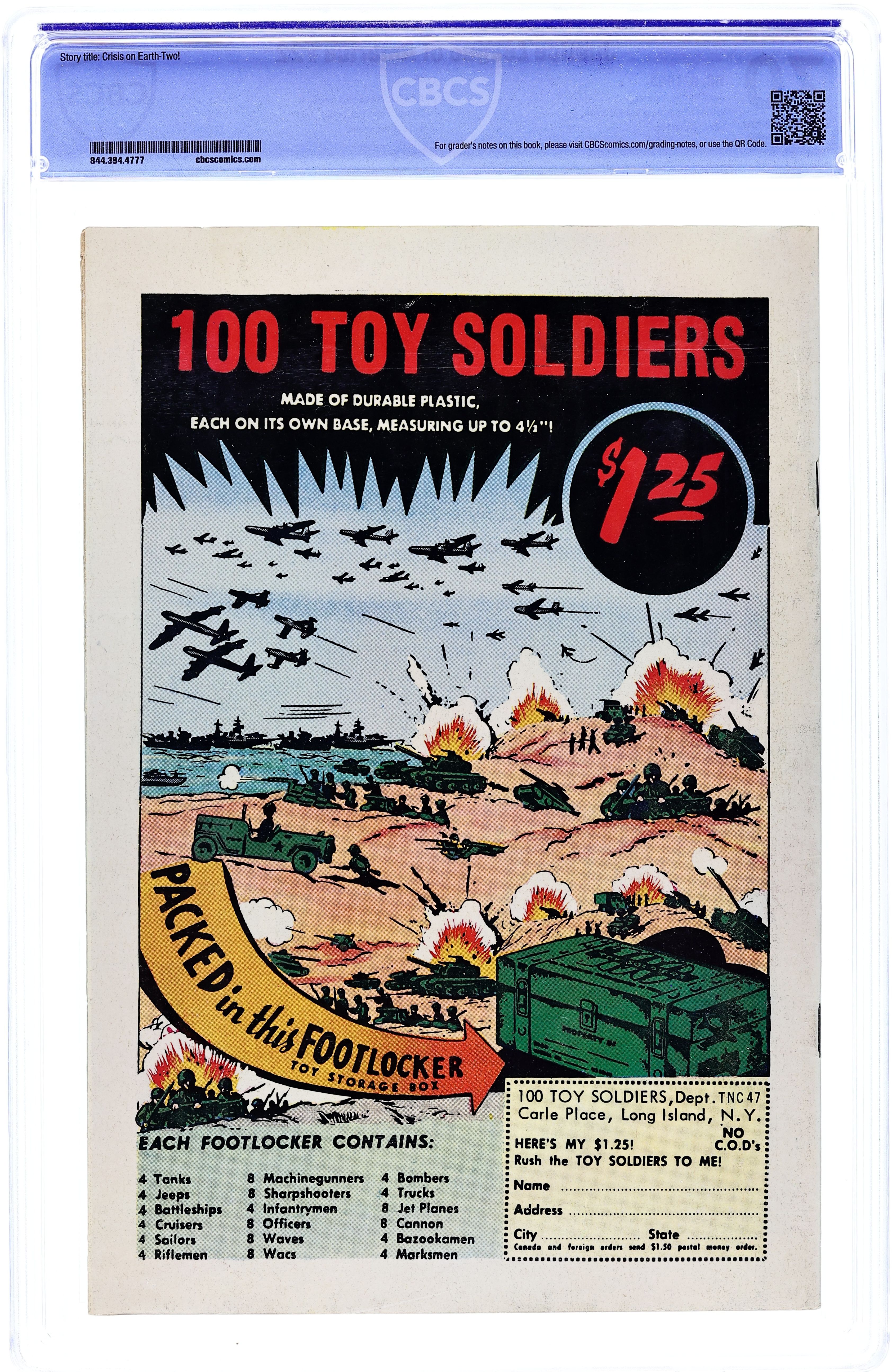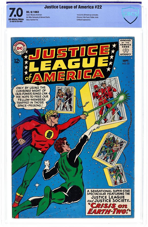 Cover art by Murphy Anderson. Crisis on Earth-Two!, script by Gardner Fox, pencils by Mike Sekowsky, inks by Bernard Sachs; The JLA and JSA fight their own villains on the opposite Earths until they are mystically transported to cages in space; They escape and take down the gathered villains. 36 pgs. $0.12. Cover price $0.12.