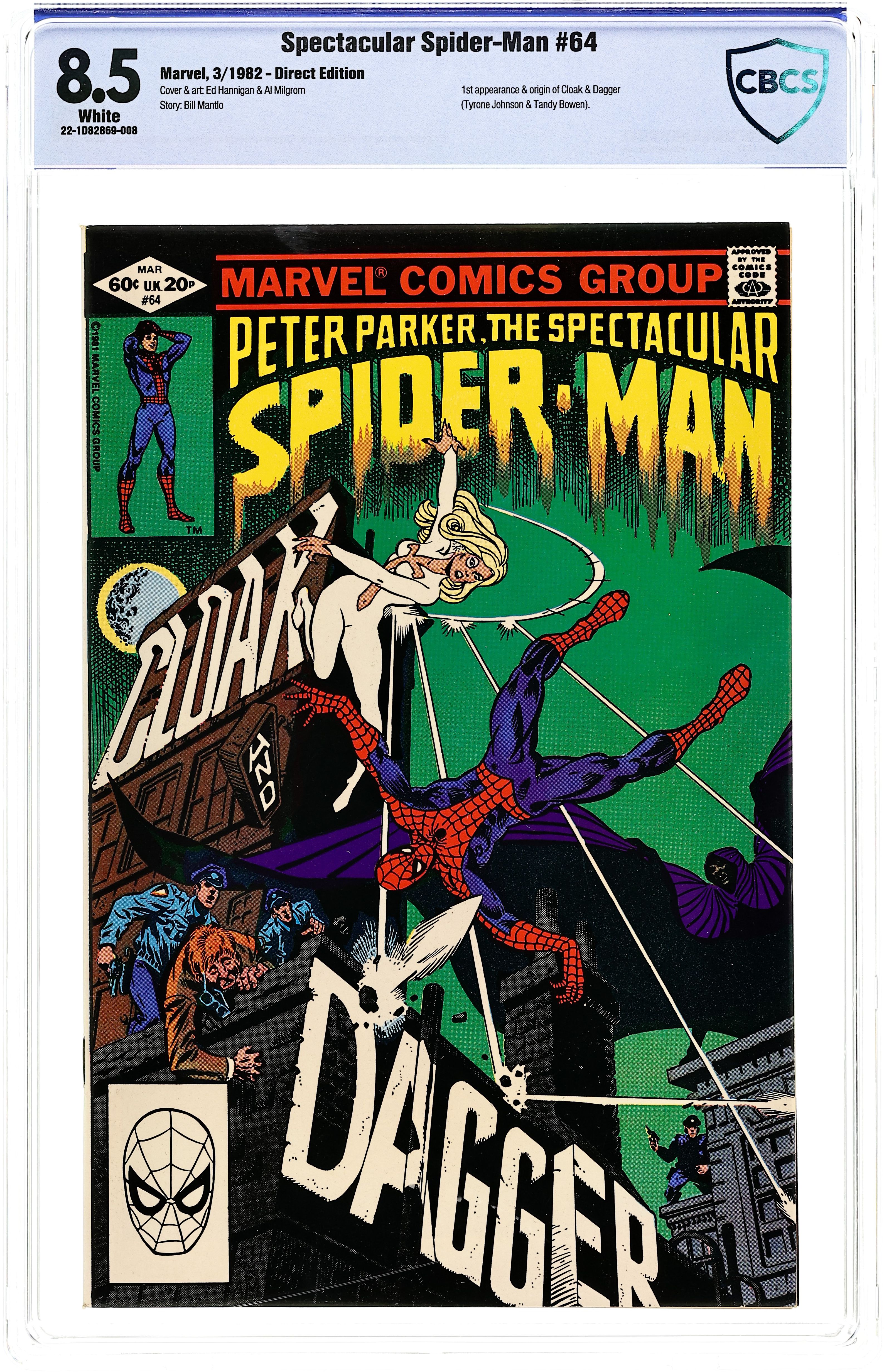 Direct Edition. "Cloak and Dagger!" Script by Bill Mantlo. Pencils by Ed Hannigan. Inks by Al Milgrom. Cover by Ed Hannigan and Al Milgrom. On a quiet night in Manhattan, the web-slinger is traveling across the city when he suddenly hears a desperate plea for help from a man running for his life! The frantic pharmacist is trying to escape from...Cloak and Dagger! The wall-crawler quickly engages the light-and-dark pair, but falls in battle to the duo's unusual powers. The next day Peter Parker picks up the investigation, and the trail of Cloak (aka Tyrone Johnson) and Dagger (aka Tandy Bowen) leads to Ellis Island! Is the Spectacular Spider-Man ready for round two with Cloak and Dagger? First appearance of Cloak and Dagger. (Notes: This issue includes a full-page ad/pin-up of Spider-Man fighting Dr. Octopus and promoting his four monthly titles. Bill Mantlo's script provides a nice history of Ellis Island. On page two Jim Mooney is erroneously listed as the inker. Al Milgrom is acknowledged as the correct inker in the letters page of issue 68. The back cover contains a Dungeons and Dragons ad with art by Bill Willingham. Cloak and Dagger appear next in Spectacular Spider-Man 69 and 70.) 32 pages Cover price $0.60.