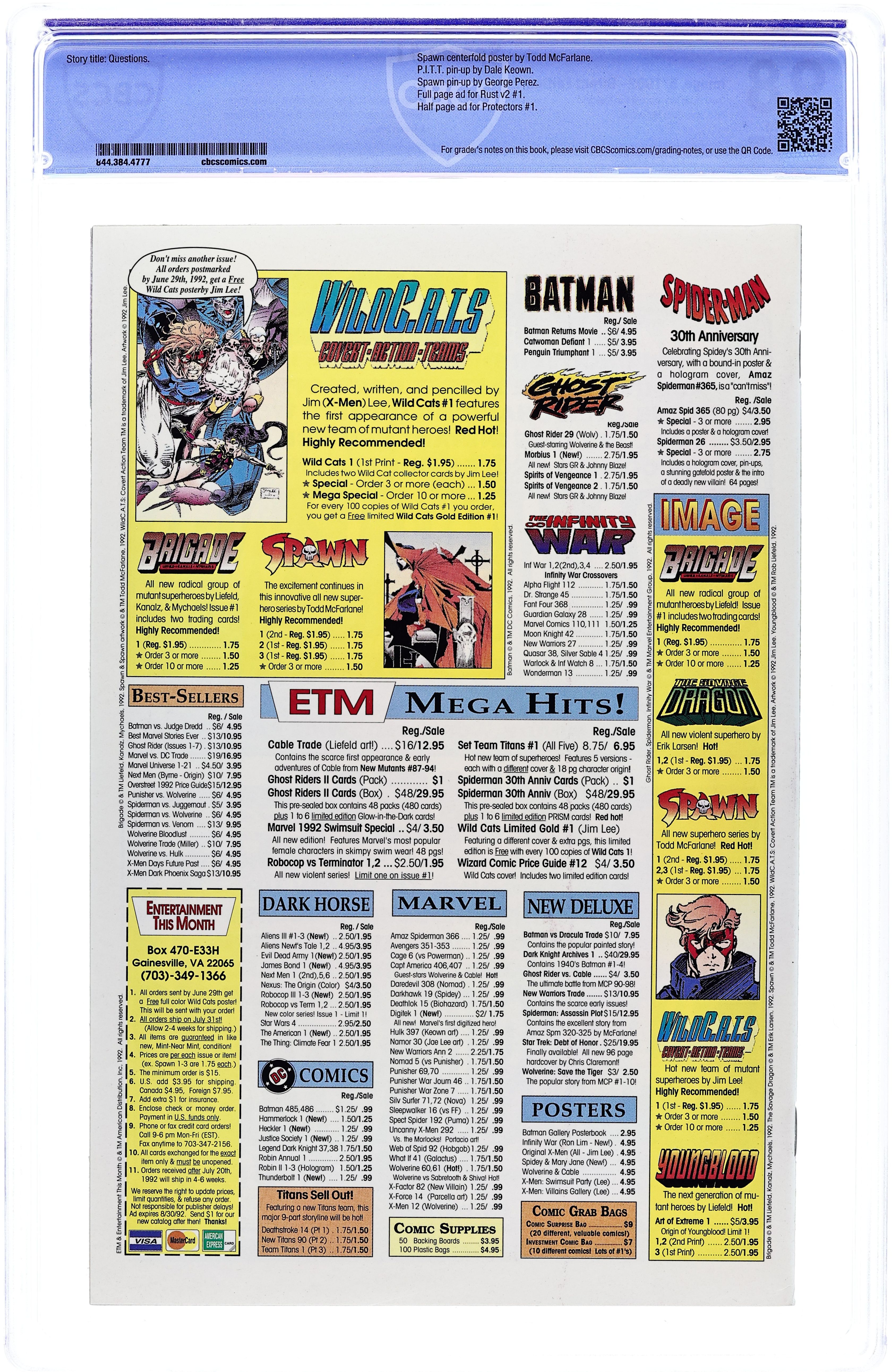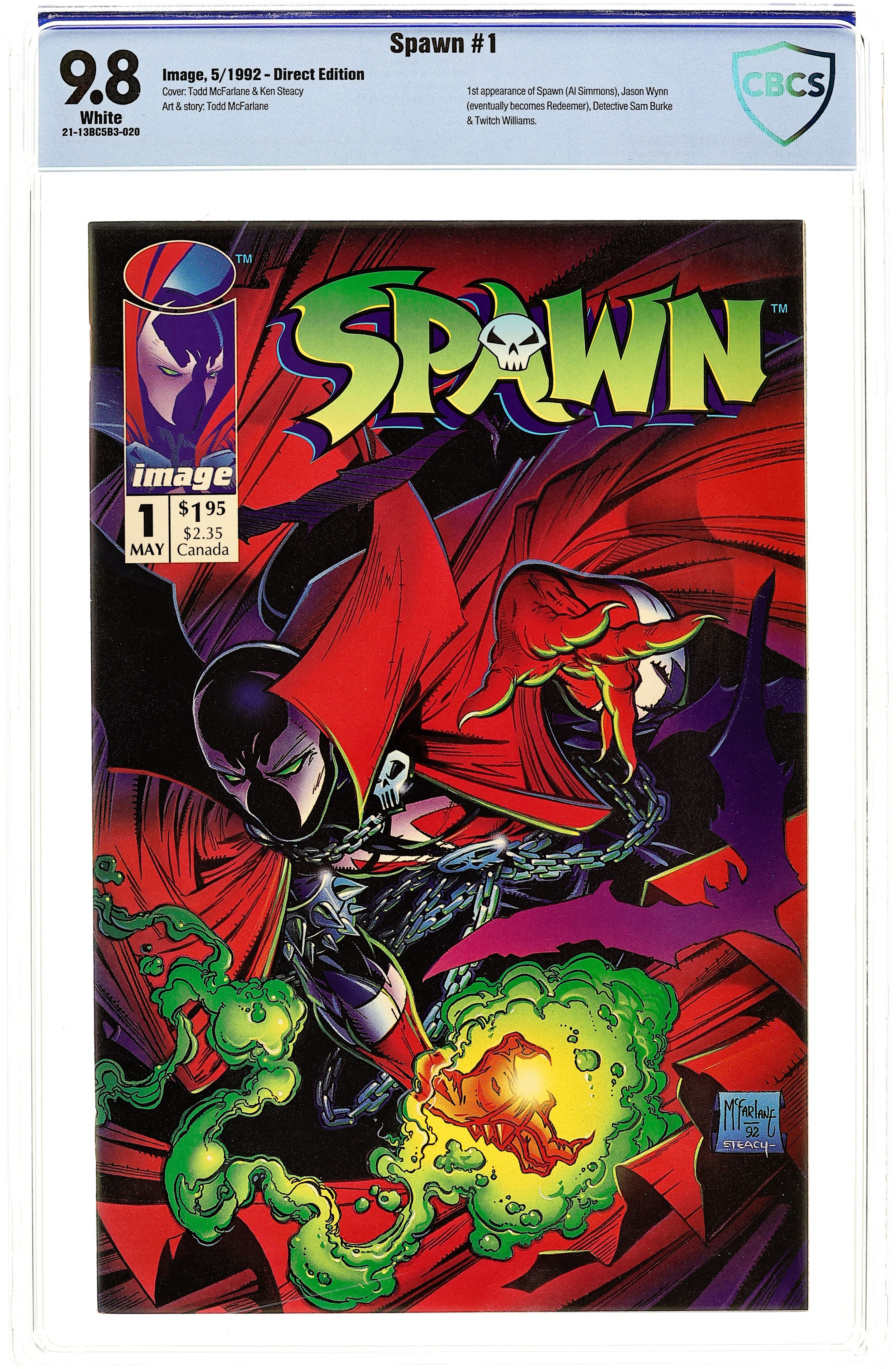 Direct Edition. Written by Todd McFarlane. Art by Greg Capullo, Todd McFarlane, and Chance Wolf. Cover by Greg Capullo and Todd McFarlane. "Demons!" Al is startled when he suddenly realizes his face has returned to the horrifying visage of Spawn. Plus, Wanda is becoming more concerned with Cyan's obsession with that shoe string. 32 pages, FC. NOTE: This issue is dedicated to the memory of Mary Kolomyjec (the inspiration for Granny Blake). Cover price $1.95.