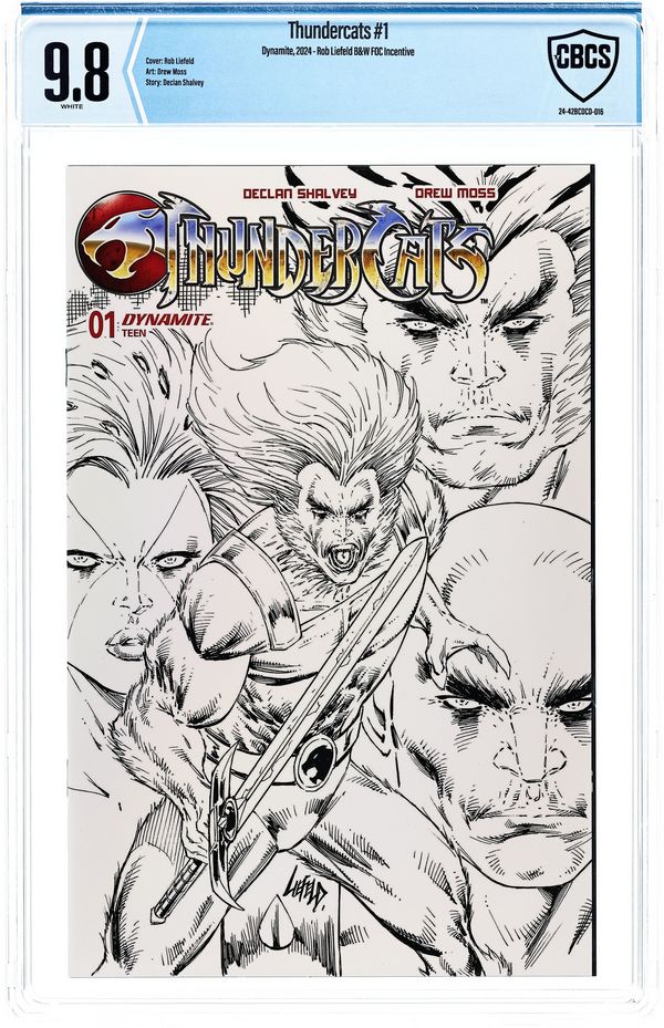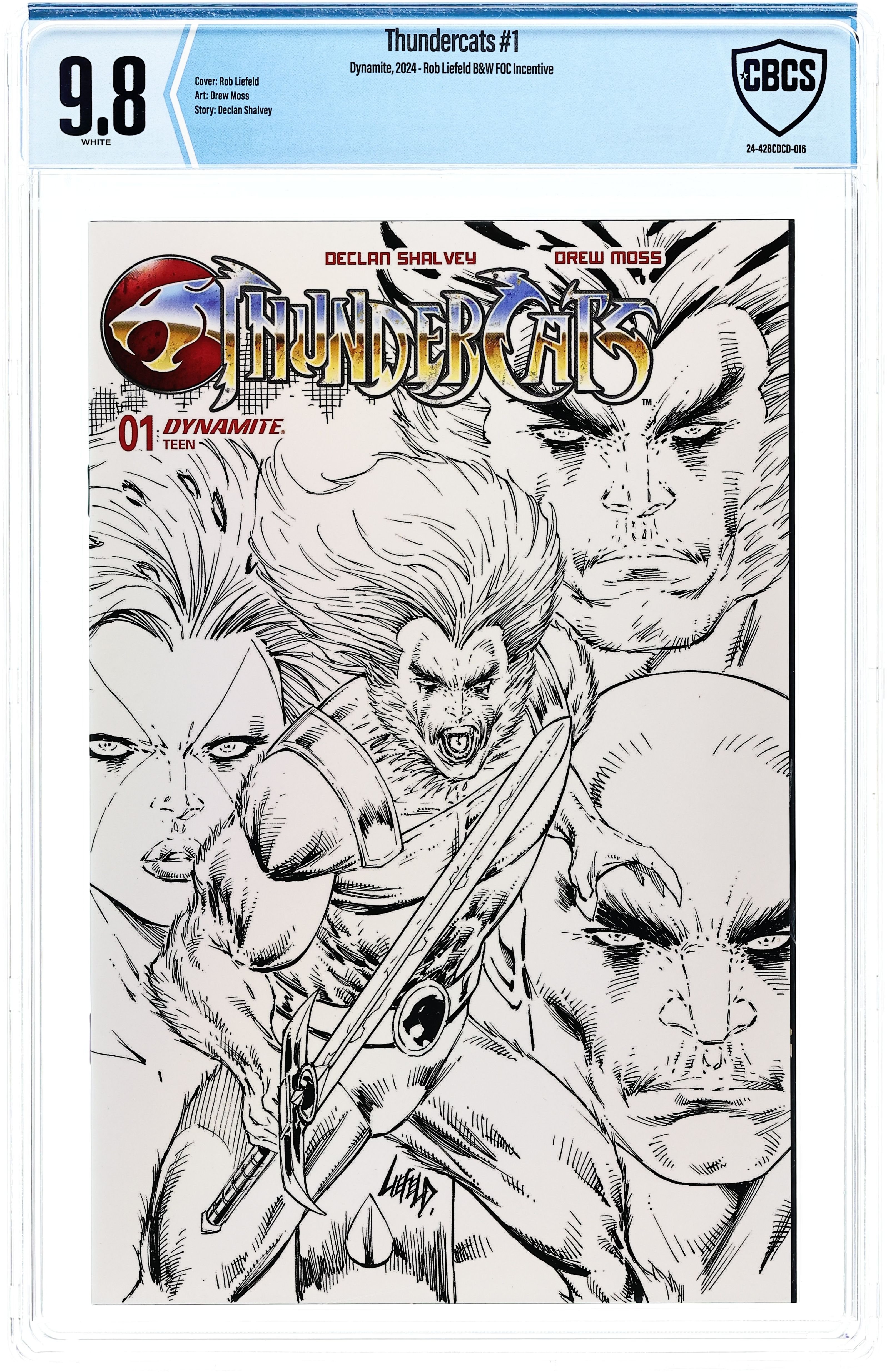 Limited 1 for 10 Retailer Incentive Variant Cover. Written by Declan Shalvey. Art by Drew Moss. Cover by Rob Liefeld. Fleeing through space to escape their dying home world, the ThunderCats were attacked en route by their mortal enemies, the Mutants of Plun-Darr. After diverting their damaged flagship to a planet called Third Earth, the surviving ThunderCats now strive to rebuild their society in harmony with the new world's natives. But the Mutants, determined to possess the ThunderCats' mystical gem, the Eye of Thundera, have tracked them down - and they've also forged an alliance with Mumm-Ra, the devil-priest of Third Earth! Now the ThunderCats, led by an inexperienced Lion-O, must band together as never before to protect their legacy from this combined enemy. But will they be able to withstand the onslaught of Mumm-Ra the Ever-Living, once he sets his eyes upon them? The triple-threat talents (writers, artists, and ThunderCats superfans) of DECLAN SHALVEY and DREW MOSS join forces to bring this exciting new entry in the ThunderCats canon to life! This premier issue features 24 story pages as well as a host of the finest cover artists the galaxy has ever seen, including SHALVEY, DAVID NAKAYAMA, LUCIO PARRILLO, JAE LEE & JUNE CHUNG, and IVAN TAO! 32 pages, full color. Rated T Cover price $4.99.