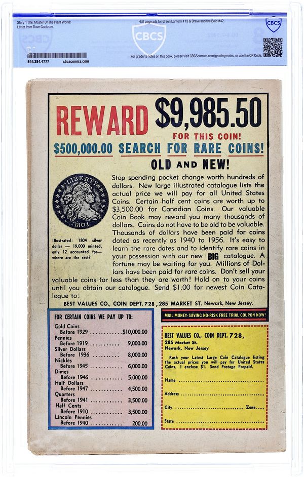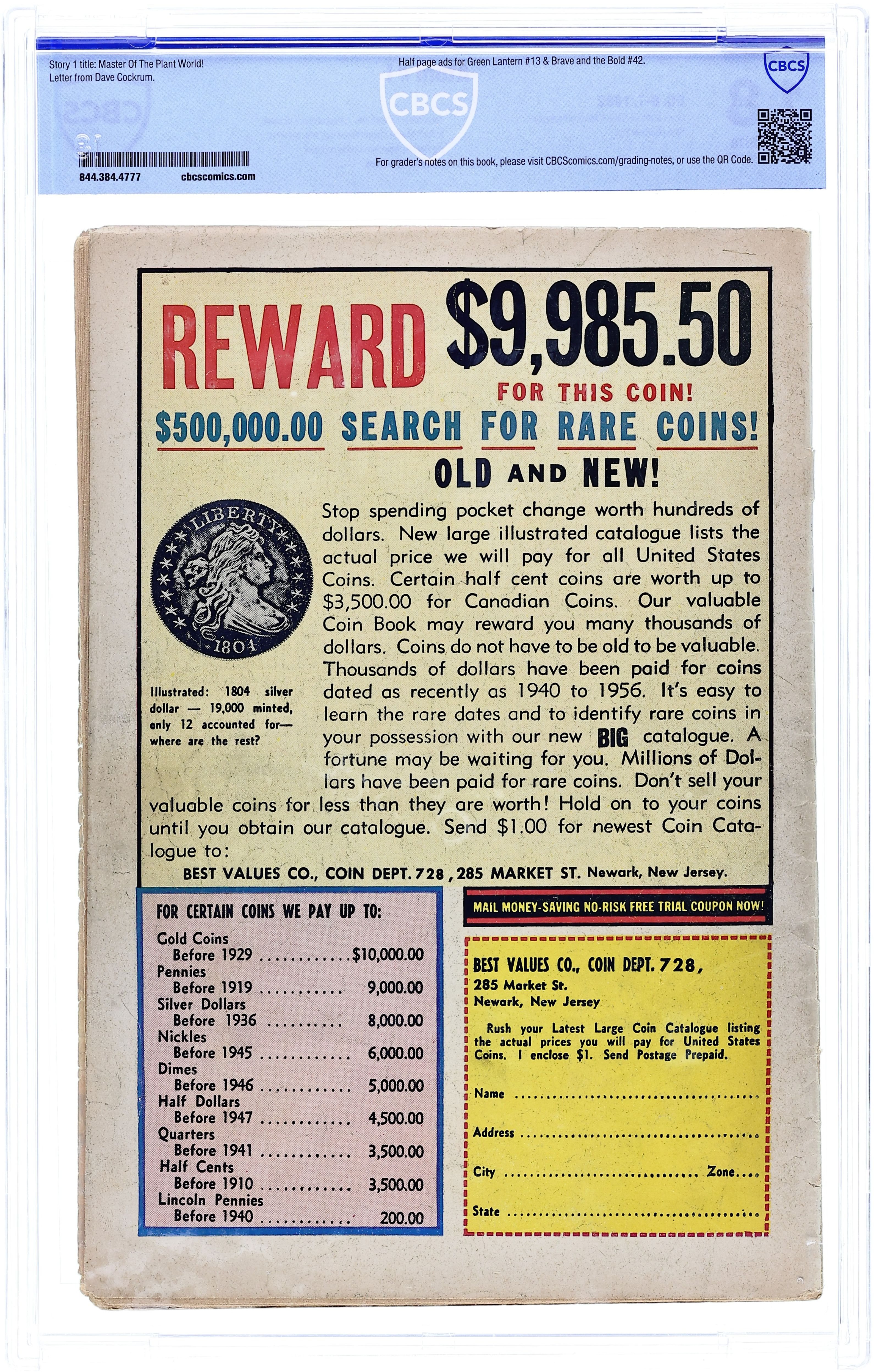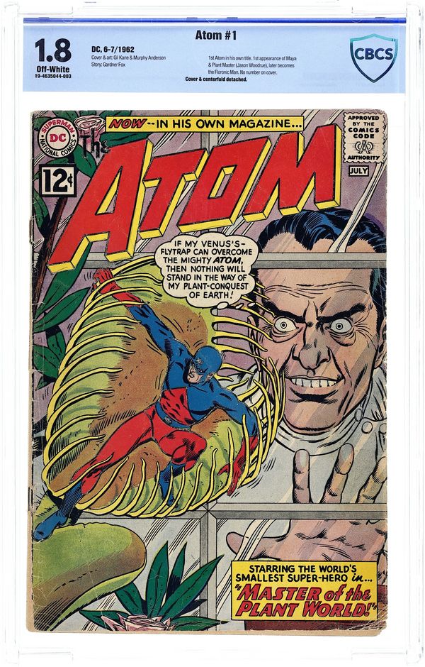 Cover pencils by Gil Kane, inks by Murphy Anderson. "Master of the Plant World!", script by Gardner Fox, pencils by Gil Kane, inks by Murphy Anderson; When a series of mysterious robberies occur which involve strange highly intelligent plants, Ray Palmer decides to investigate as the Atom when he learns about the strange circumstances from Jean Loring; As the Atom, Ray follows Jean as she goes on fact finding about the type of plants that are used, and decides to wait out in a greenhouse to keep a secret eye on Jean; When Jean nods off, Atom notices a group of Dryads that suddenly spring out of the flowers and fly away on petals. Atom follows after them and learns that they are under the control of a criminal called the Plant Master, who intends to use his mutated plants to try and take over the world; Trying to stop the Planet Master, the Atom is trapped in a Venus fly trap while the Planet Master leaves with the Dryads to initiate his plan. 36 pgs., full color. Cover price $0.12.