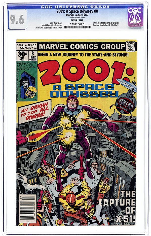 Mark Jeweler Advertisement Insert Variant. Based on concepts from the film by Stanley Kubrick & Arthur C. Clarke. "The Capture of 'X-51!''" Jack Kirby art & script; Mike Royer inks & letters; Petra G. colors; 1st appearance of Mr. Machine aka Machine Man aka X-51 aka Aaron Stack. 1st appearance and death of Doctor Abel Stack, Machine Man's creator/father; Col. Kragg app. Cover price $0.30.