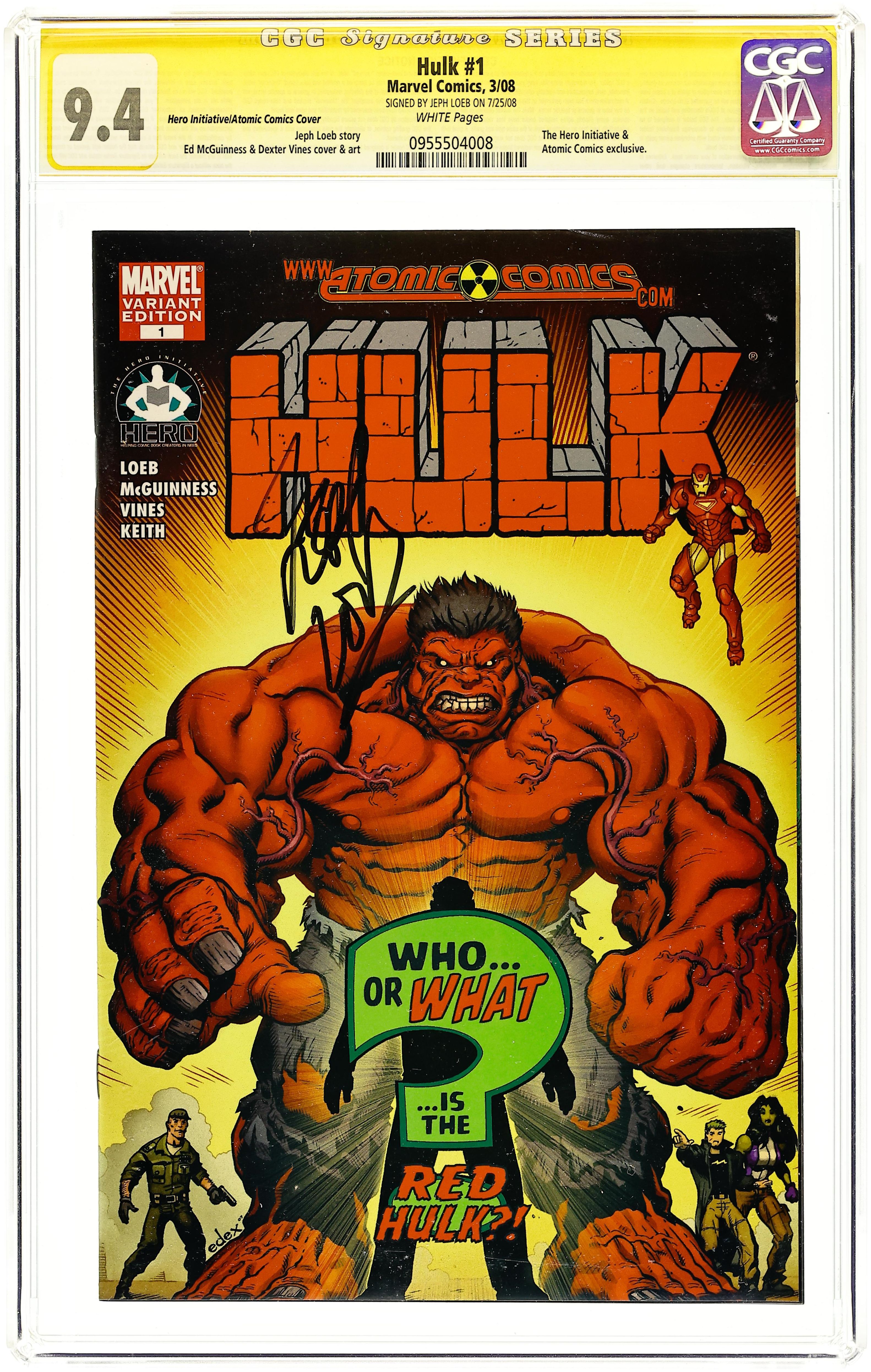 The Hero Initiative AtomicComics.com Exclusive Cover. Limited to 5,000 copies. Cover by Ed McGuinness. Written by JEPH LOEB Pencils by ED MCGUINNESS. Superstars JEPH LOEB and ED MCGUINNESS will change the way you see THE HULK! In this startling origin epic, the breathtaking events that ended World War Hulk rocket into this brand-new Hulk title. When one of The Hulk's oldest cast members is murdered, everyone turns to the team of IRON MAN, SHE-HULK and LEONARD SAMSON to solve the grizzly case. All the evidence points to the Hulk as the killer-but {CLASSIFIED}! Join us for a brand--new story and a brand-new team who loves the Hulk as much as you do!