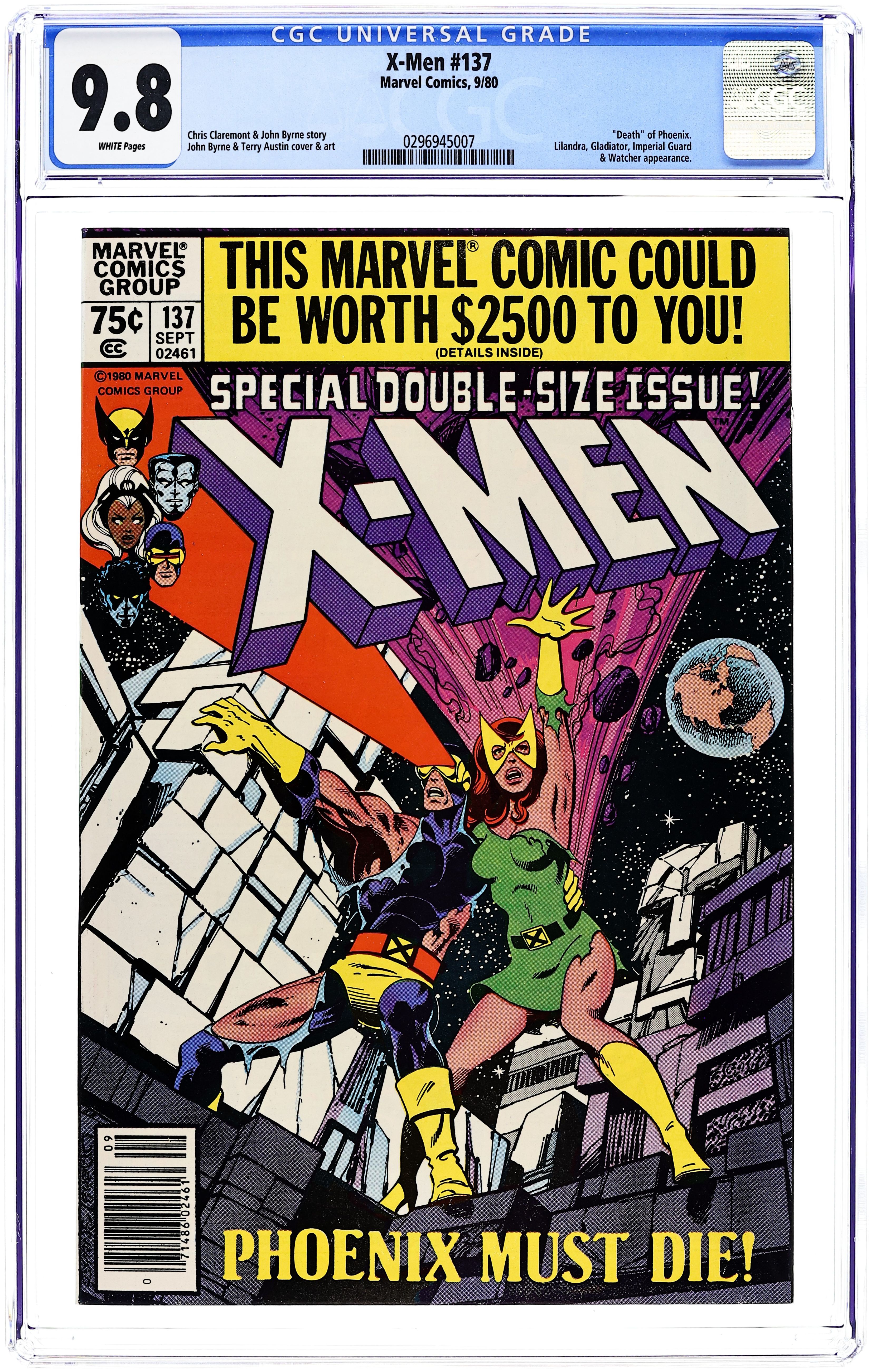 Newsstand Edition. The Dark Phoenix Saga: Part 9 of 9 - "The Fate of Phoenix!" Guest-starring the Watcher. Story by Chris Claremont and John Byrne. Art by John Byrne and Terry Austin. The persona of the Dark Phoenix has subsided, but for how long? The Shi'ar Empire doesn't plan to wait and find out. While as Dark Phoenix, Jean murdered untold billions, and the alien empire plans to see her pay for her crimes. Now, the X-Men must battle the Shi'ar Imperial Guard in a dual to decide the fate of Jean Grey. Don't miss the stunning conclusion to the greatest X-Men saga of all time!