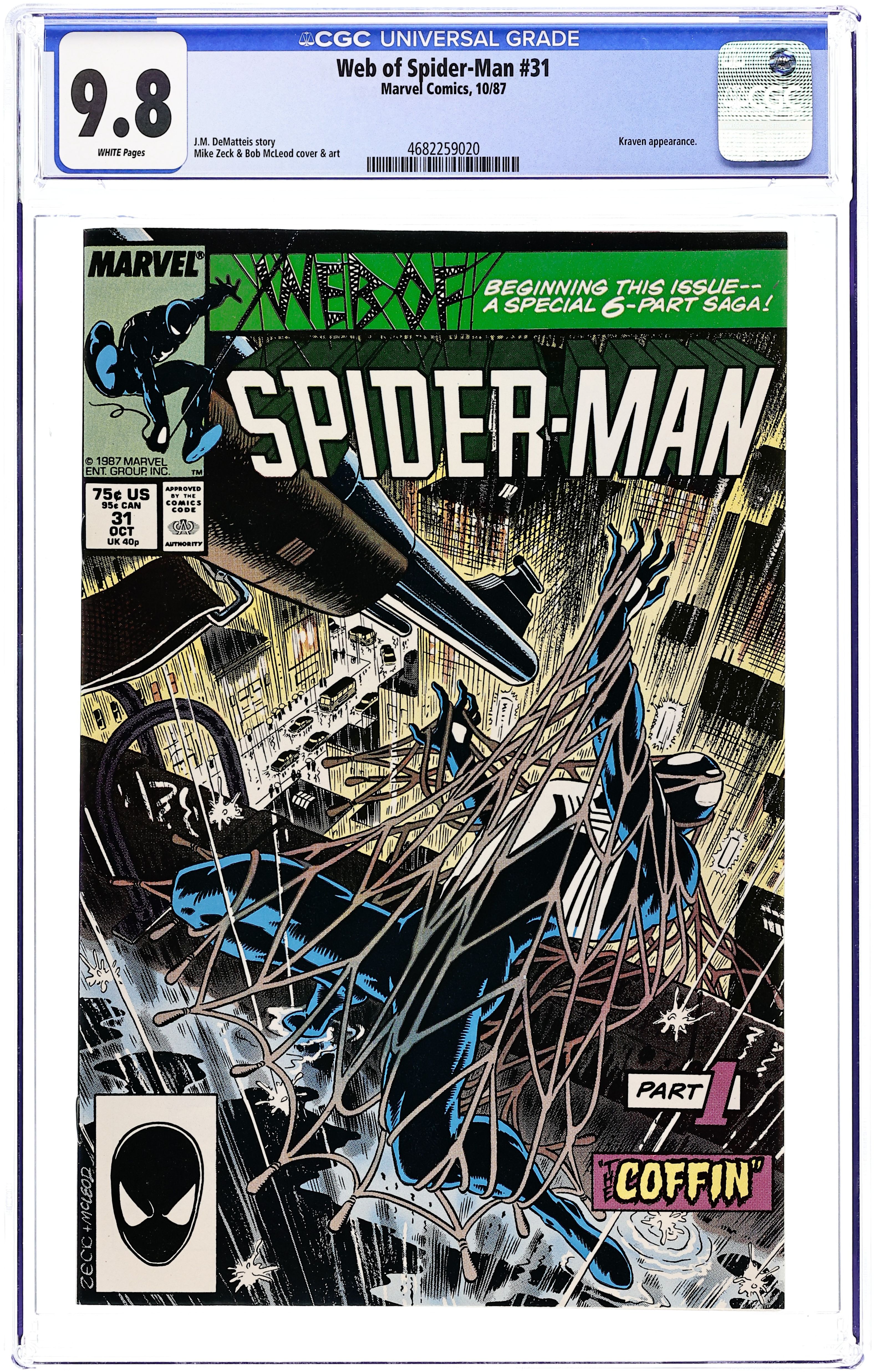 Direct Edition. Kraven's Last Hunt - Part 1 of 6 - "The Coffin" Story by J. M. DeMatteis. Art by Mike Zeck and Bob McLeod. This is the first issue of the Kraven's Last Hunt storyline. A deranged Kraven begins his final quest to exterminate Spider-Man. He ambushes the web-slinger and successfully captures him. Now it appears that a comatose Spider-Man has been buried alive. The situation does not look good. Story continues in Amazing Spiderman 293. 32 pages Cover price $0.75.