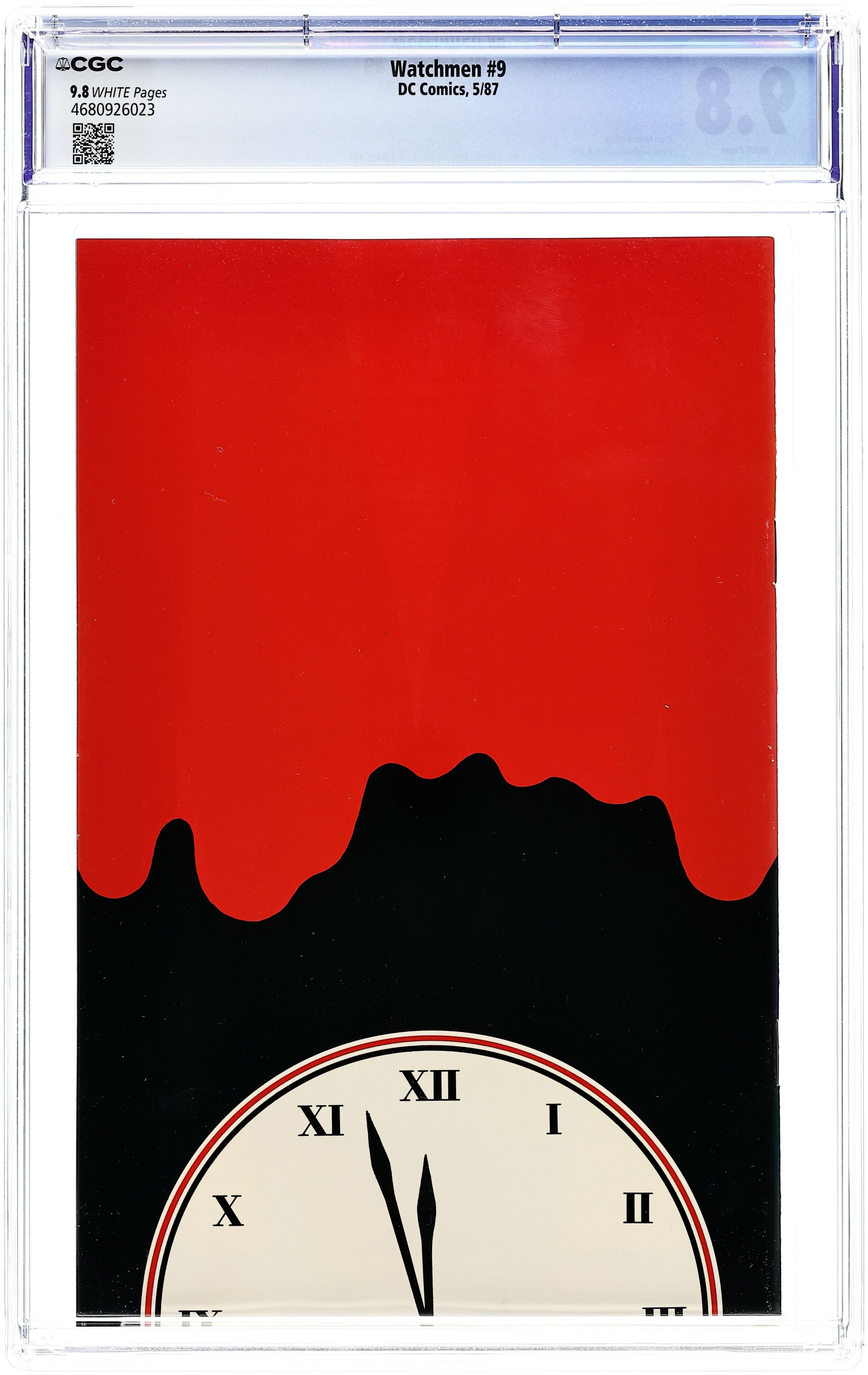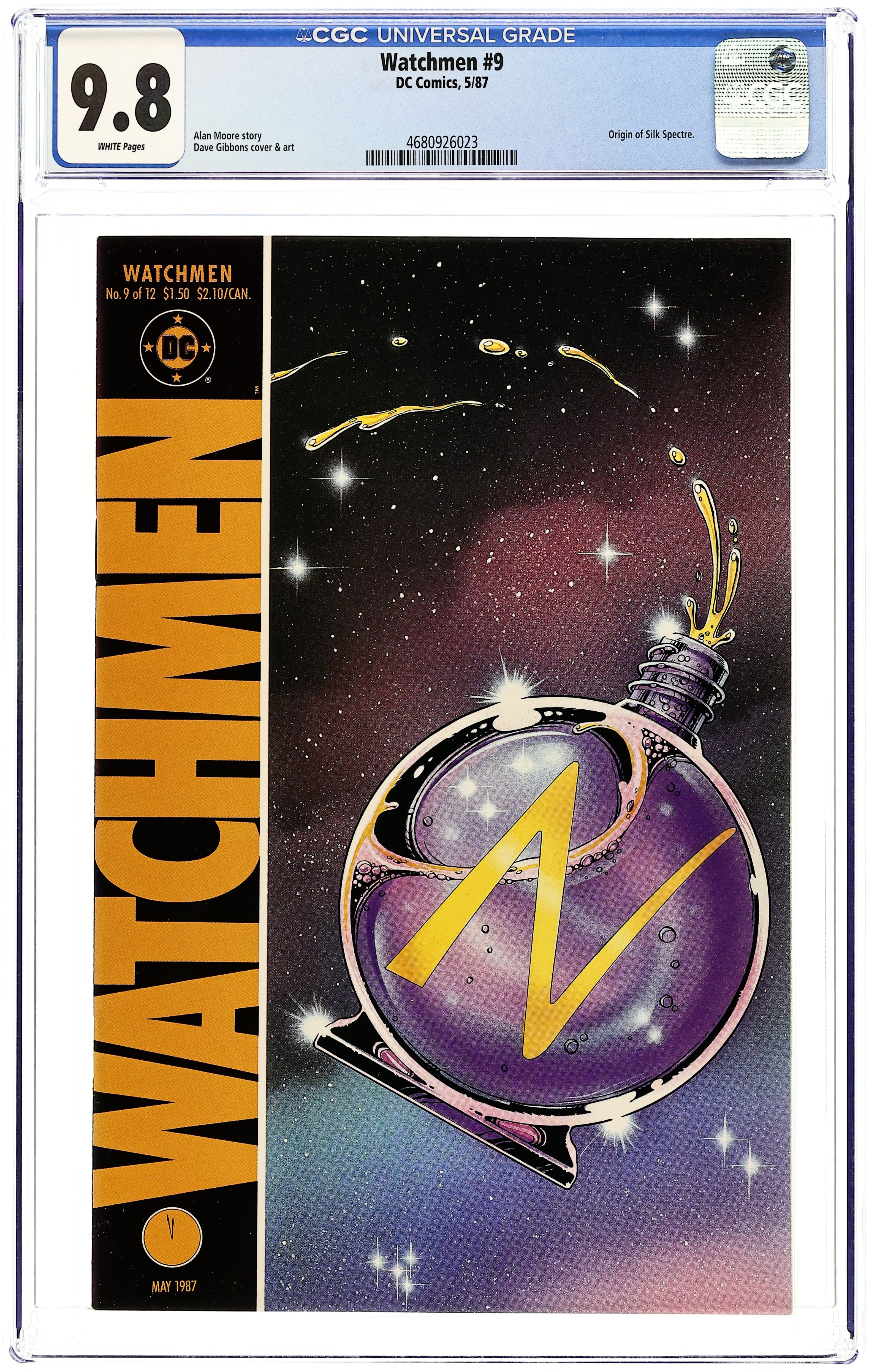 "The darkness of mere being". Part 9 of 12. Story by Alan Moore. Art and cover by Dave Gibbons. As the Silk Spectre attempts to convince Dr. Manhattan to return to Earth, she learns the shocking truth about her parentage. Includes four page fictional text feature with pieces from the scrapbook of Sally Jupiter. 32 pages. Full color. No ads. Cover price $1.50.