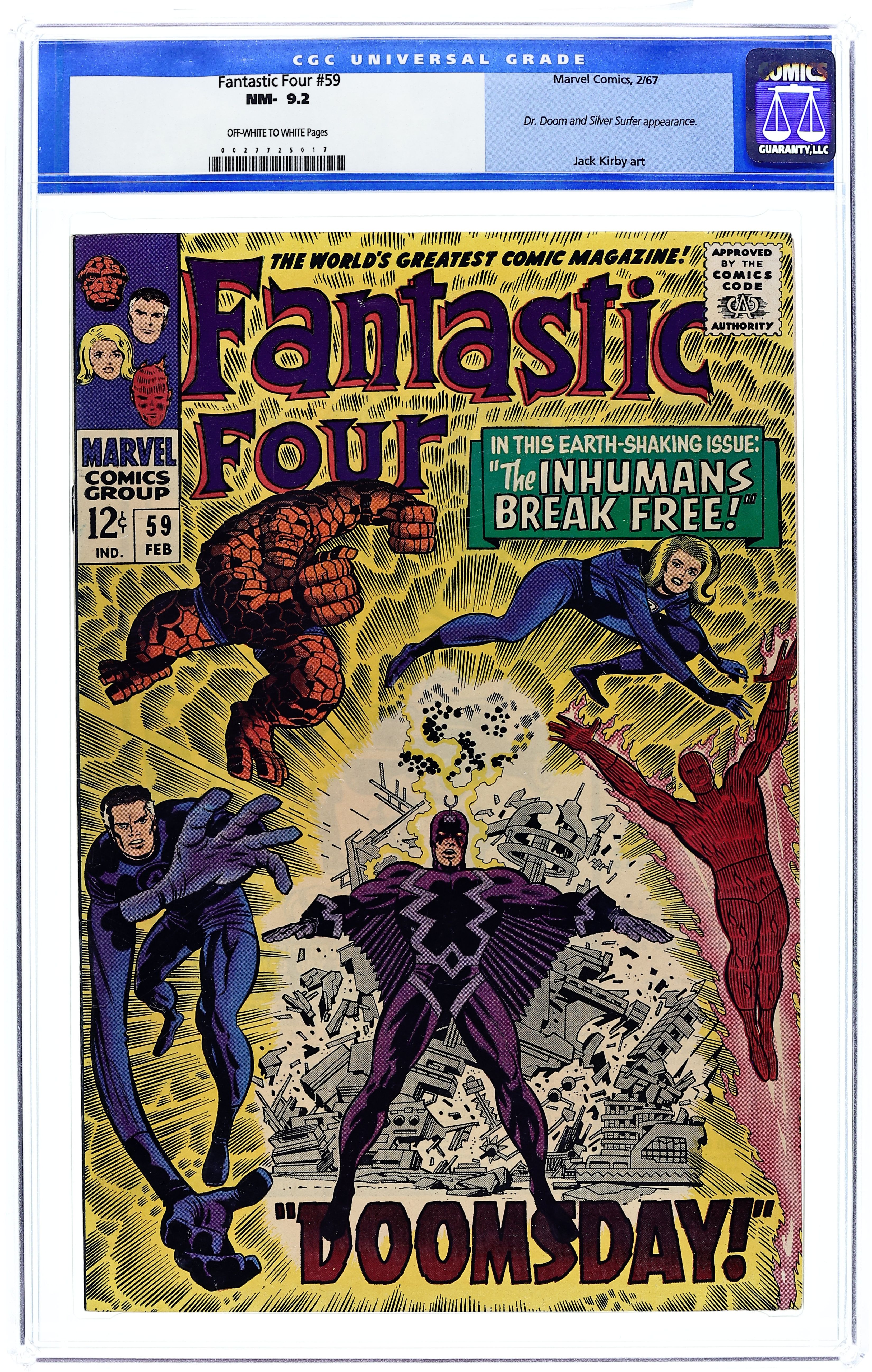Cover pencils by Jack Kirby, inks by Joe Sinnott. Doctor Doom steals the Silver Surfer's cosmic powers (part 3 of 4) in Doomsday, script by Stan Lee and Jack Kirby (co-plot), pencils by Jack Kirby, inks by Joe Sinnott; Dr. Doom wreaks havoc across the globe with the Power Cosmic; Black Bolt destroys the barrier that was imprisoning the Inhumans. Brief Inhumans appearance. 36 pgs. $0.12. Cover price $0.12.