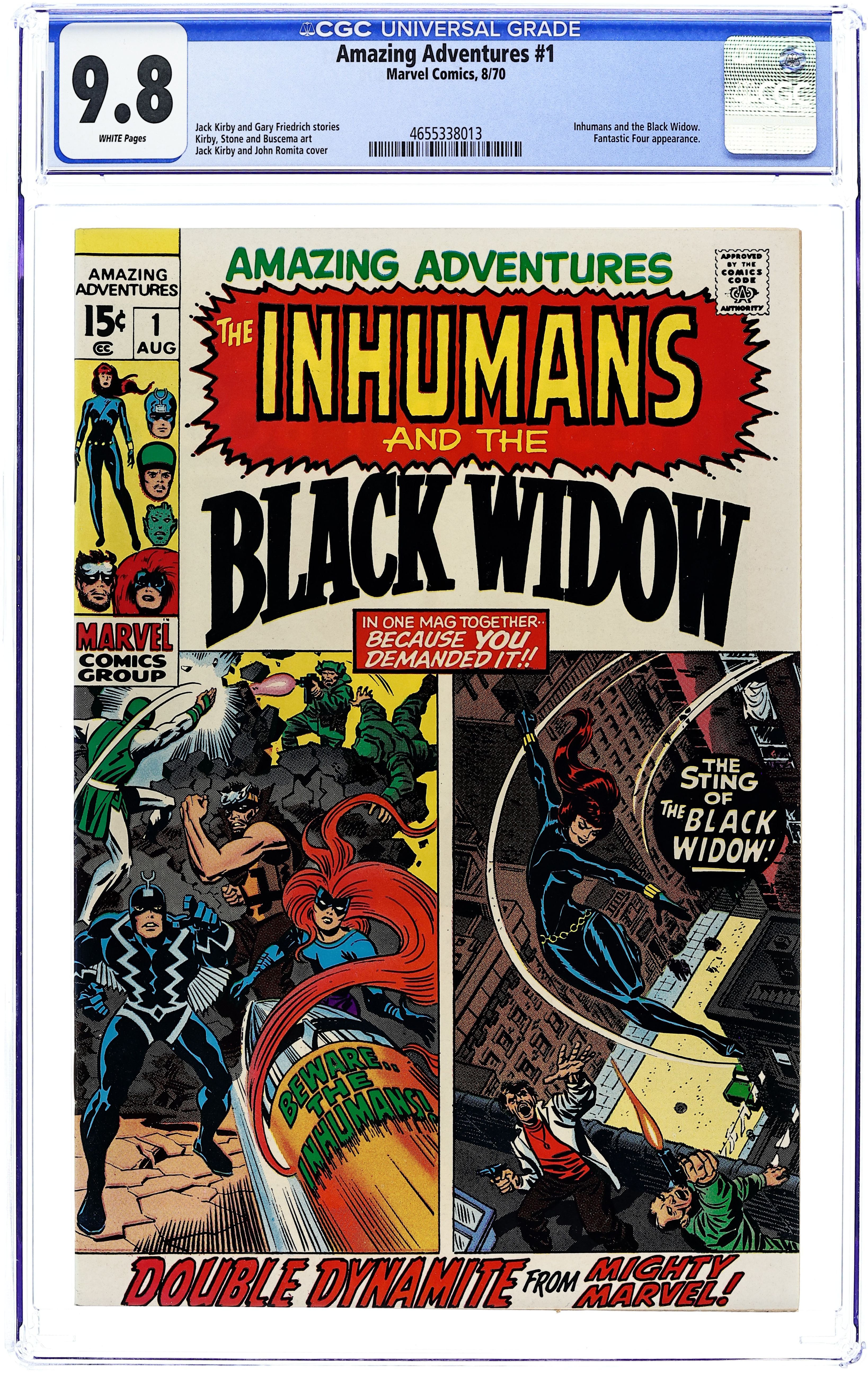 Cover pencils by Jack Kirby (Inhumans) and John Romita (Black Widow), inks by John Romita. "Beware... the Inhumans!", script by Jack Kirby, pencils by Jack Kirby, inks by Chic Stone; Two missiles are shot at the Inhumans; The second one is destroyed just before it hits and the wreckage points to the Fantastic Four as the ones firing it. "Then Came... the Black Widow," script by Gary Friedrich, pencils by John Buscema, inks by John Verpoorten; Black Widow, bored by her civilian life, gets a new costume. 36 pgs, full color. $0.15. Cover price $0.15.