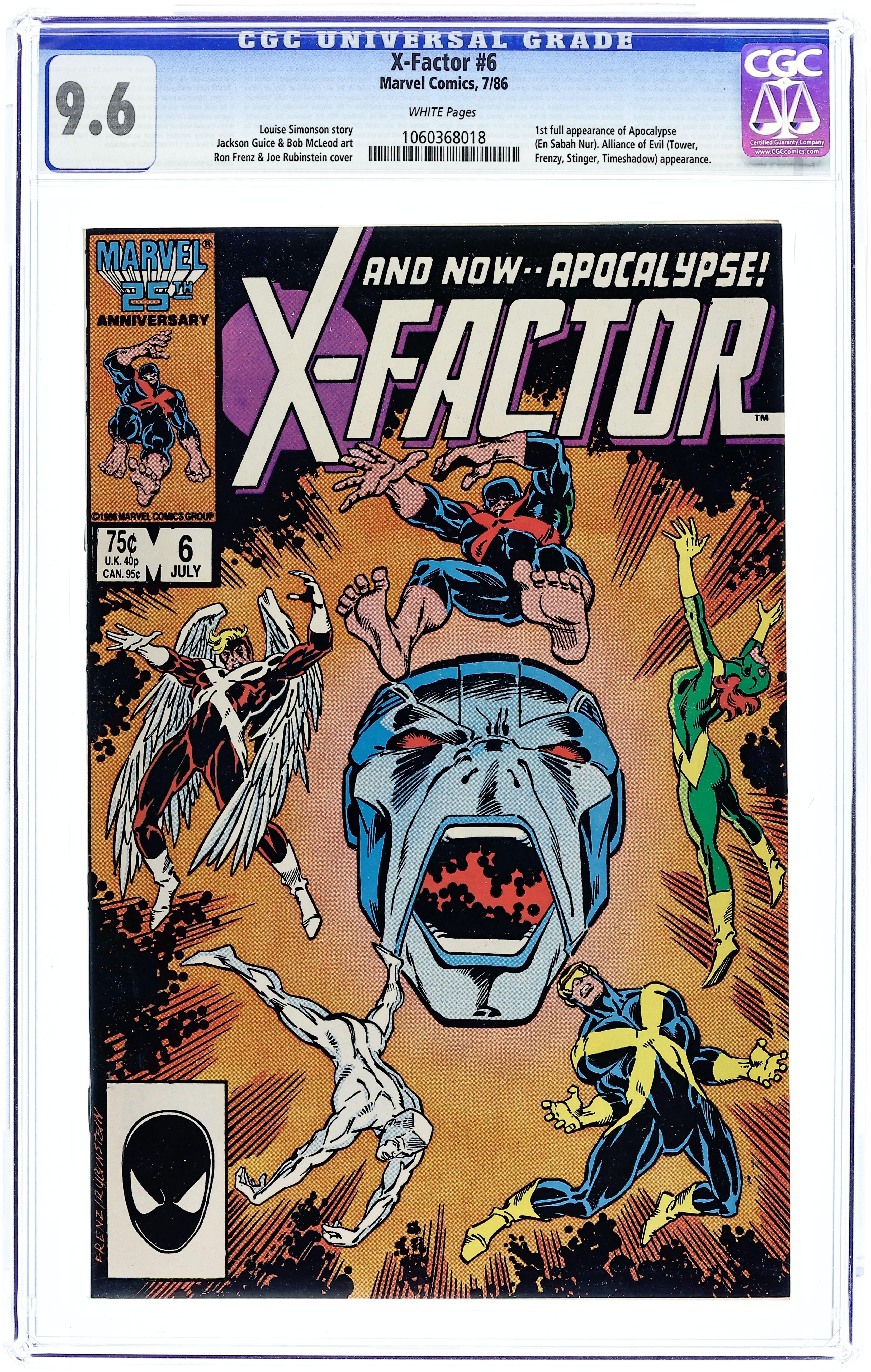 Direct Edition. "Apocalypse Now!" Part 2 of 2. 1st full appearance of Apocalypse. Story by Louise Simonson. Art by Jackson Guice and Bob McLeod. Cover by Ron Frenz and Joe Rubinstein. Cyclops begins to worry that the group's X-Factor ads are fueling mutant paranoia among humans. Plus, the last time X-Factor fought the Alliance of Evil they were soundly defeated. Can they take down their adversaries in time to save the life of a fellow mutant, before it's too late? And, witness the fury and power of Apocalypse, a mutant tyrant who believes in a world where only the strong survive. Cover price $0.75.