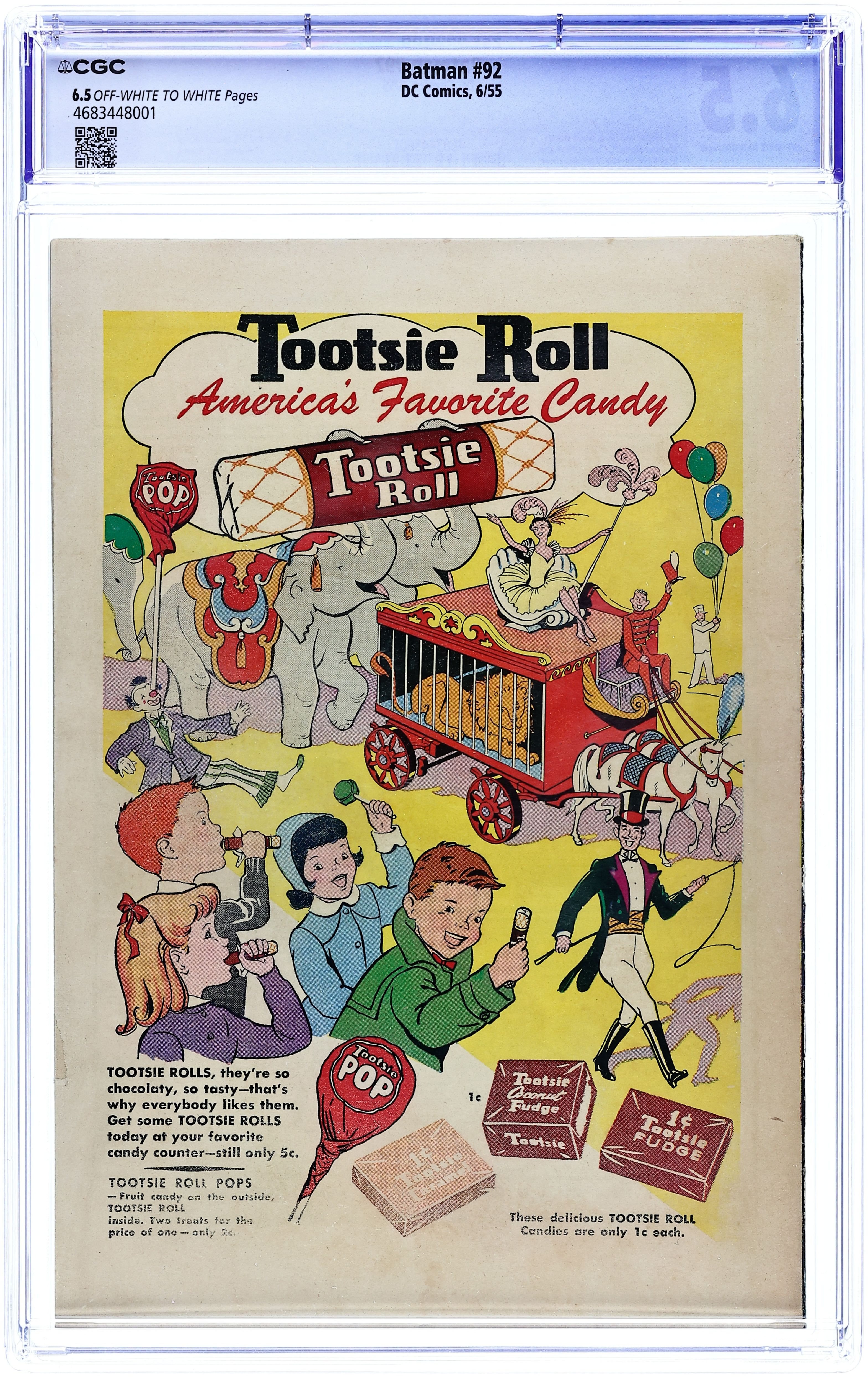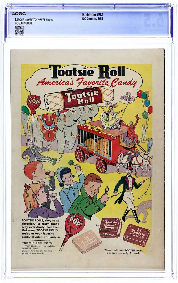 Ends Apr 27 7:26 PM CST Bid History 14 bids Current Bid $105 Your Secret Max Bid If you'd like to bid, please log in or register. Cover pencils by Dick Sprang, inks by Charles Paris. "The Joker's Comedy of Errors!", script by Bill Finger, pencils by Bob Kane (Batman and Robin figures only) and Lew Sayre Schwartz, inks by Charles Paris; The Joker is obsessed with recreating some of historys most famous blunders; He tries to force Batman into making mistakes. -page Casey the Cop story by Henry Boltinoff. "The Movie Stars Who Died Twice!", script by Bill Finger, pencils by Dick Sprang, inks by Charles Paris; Batman and Robin investigate the case of film stars who start dying in the same way as their respective characters died in the movies. One-page Tootsie Roll ad, "Captain Tootsie and his Vacation-Time Pals" by Bill Schreiber. One-page Jerry the Jitterbug story by Henry Boltinoff. Script Sleuths article by Barbara Fairbanks, art by Raymond Perry. Half-page Casey the Cop story by Henry Boltinoff. "Batman II and Robin, Junior!", script by Bill Finger, pencils by Bob Kane (Batman and Robin figures only) and Lew Sayre Schwartz, inks by Charles Paris; Robin becomes disobeys Batman's orders; He is saved by the Dark Knight, and once they're back at the Batcave, Bruce scolds Robin for disobeying him. Sweet Land of Liberty public service announcement starring Peter Porkchops, script by Jack Schiff, art by Otto Feuer. One-page Tootsie Roll ad, "Captain Tootsie and his Vacation-Time Pals" by Bill Schreiber. 52 Pages, Full Color. Cover price $0.10.