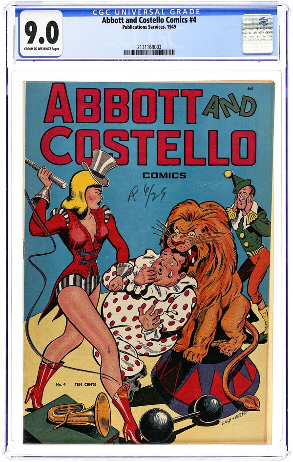 Cover by Lily Renee and Eric Peters. Stories by John Graham and others. Art by Lily Renee and Eric Peters. The classic comedy duo of TV, radio and film starred in this comic at the height of their careers. After surviving a train wreck and a tiger attack, the boys join a traveling circus. They try to help the beautiful ringmaster save her circus from sabotage by minions of the Big Boss, in a story with art by pioneering female comics artist Lily Renee. Plus two joke articles "written" by Bud Abbott and Lou Costello, about Lou's career as a boxer. Bad-girl cover by Renee and Peters. Cut the Clowning!; The Chubby Cyclone; Canvasback Costello. 32 pages, Full Color. Cover price $0.10.
